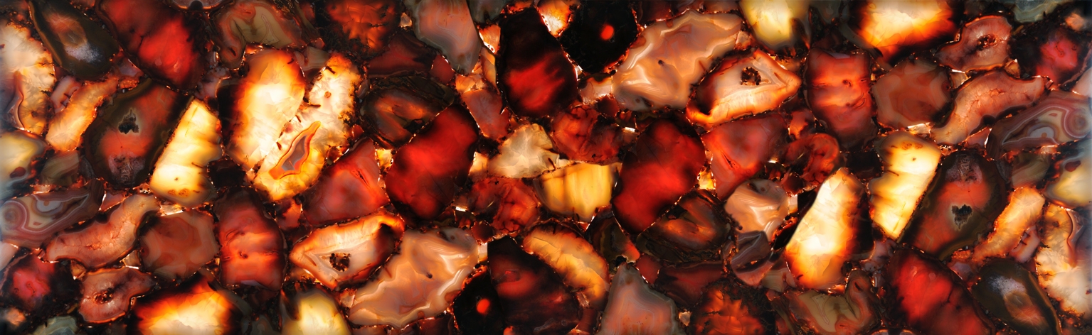 Поделочные и полудрагоценные камни в интерьере – актуальная тенденция в последние годы. Дизайнеры ценят агат за разнообразие оттенков, яркую и контрастную структуру. Он идеально подходит для интерьеров с элементами восточной роскоши, прекрасно смотрится в комбинации с металлом и другими искусственными материалами. Комбинируя агат со стеклом можно добиться эффекта витража в технике Тиффани. Агатовые слэбы часто используются для облицовки стен и потолков, причем рисунок агата позволяет компоновать пластины без видимых стыков. Излюбленный прием дизайнеров – симметричное расположение двух плит.