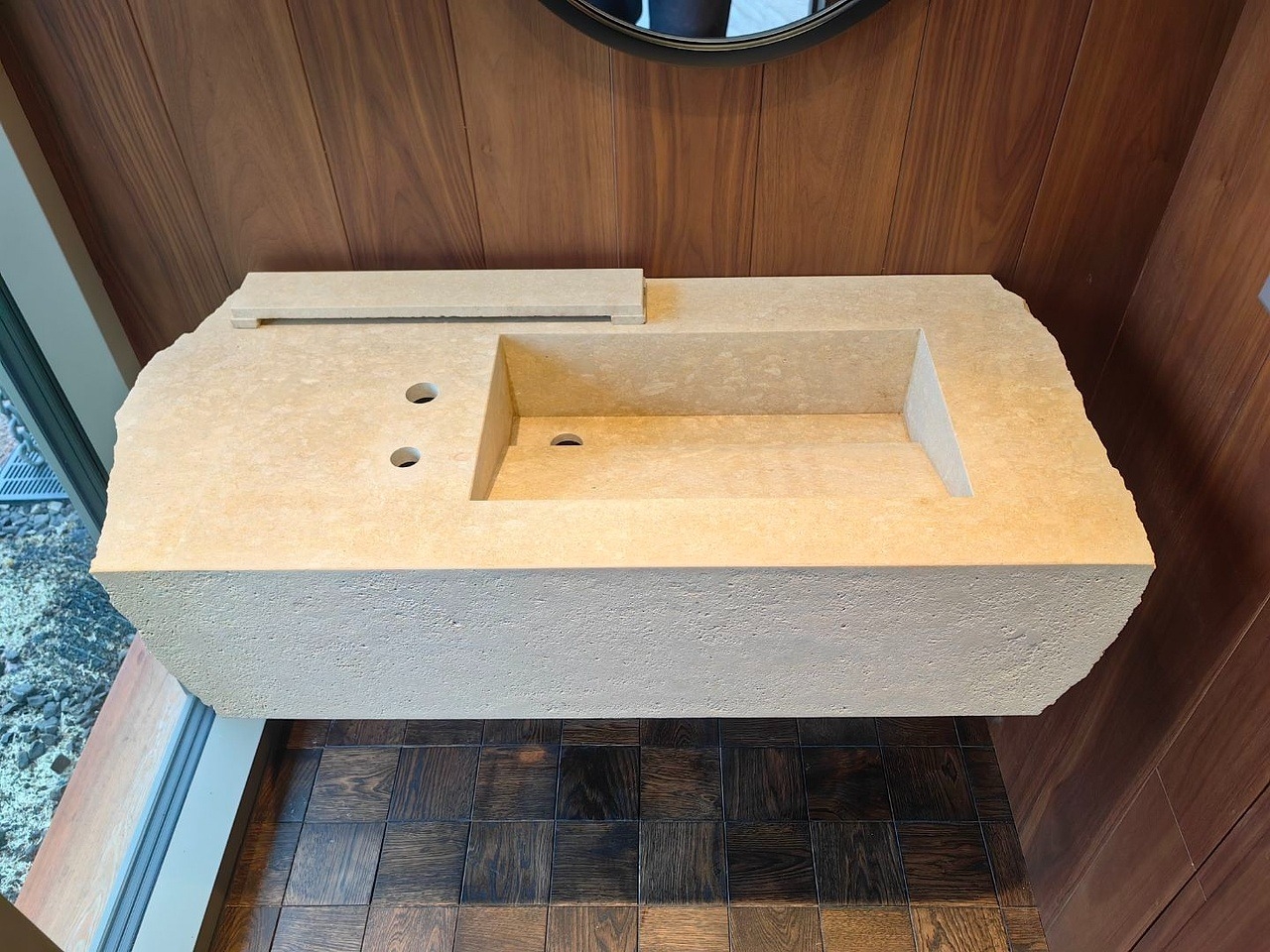 Мы изготовили монолитную раковину, выточенную из единого блока Travertine Eurasian. Такое решение позволило подчеркнуть природную красоту камня и избежать лишних соединений.