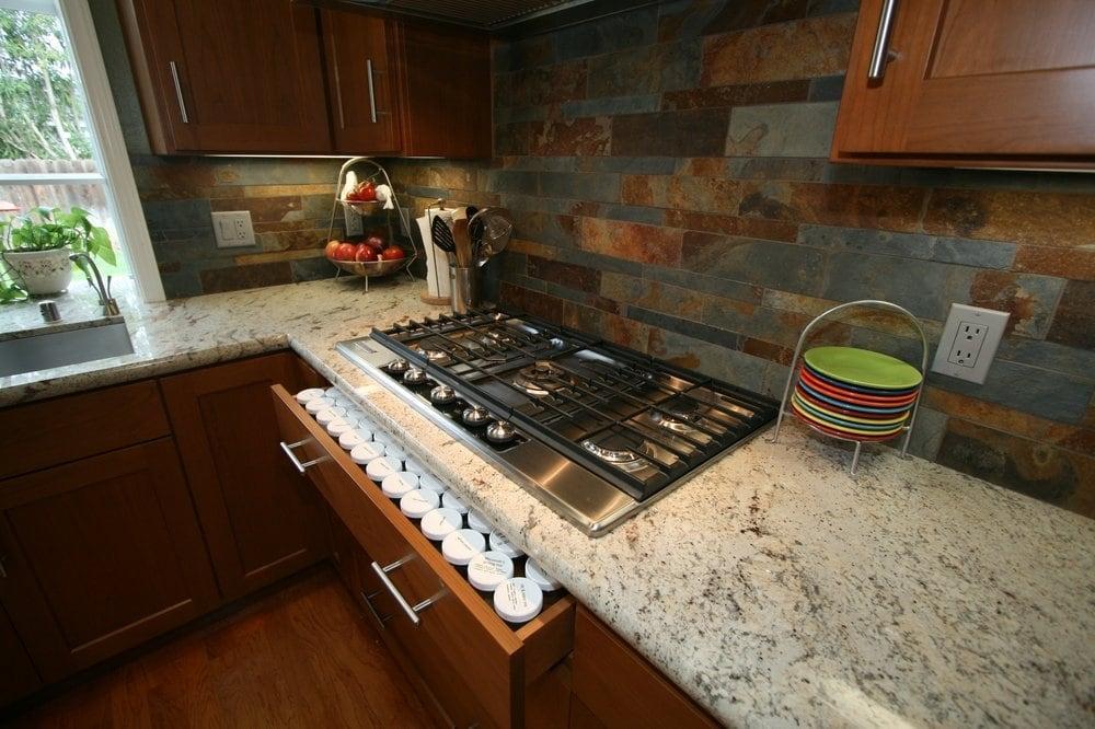 Грубая естественность сланца Multicolor Slate становится все более востребована в современных проектах. Сланцевая отделка "каменная гряда" на фартуке имитирует природное залегание камня, создавая атмосферу близости с природой. Рыжие разводы камня отлично перекликаются с цветом мебельного гарнитура.
