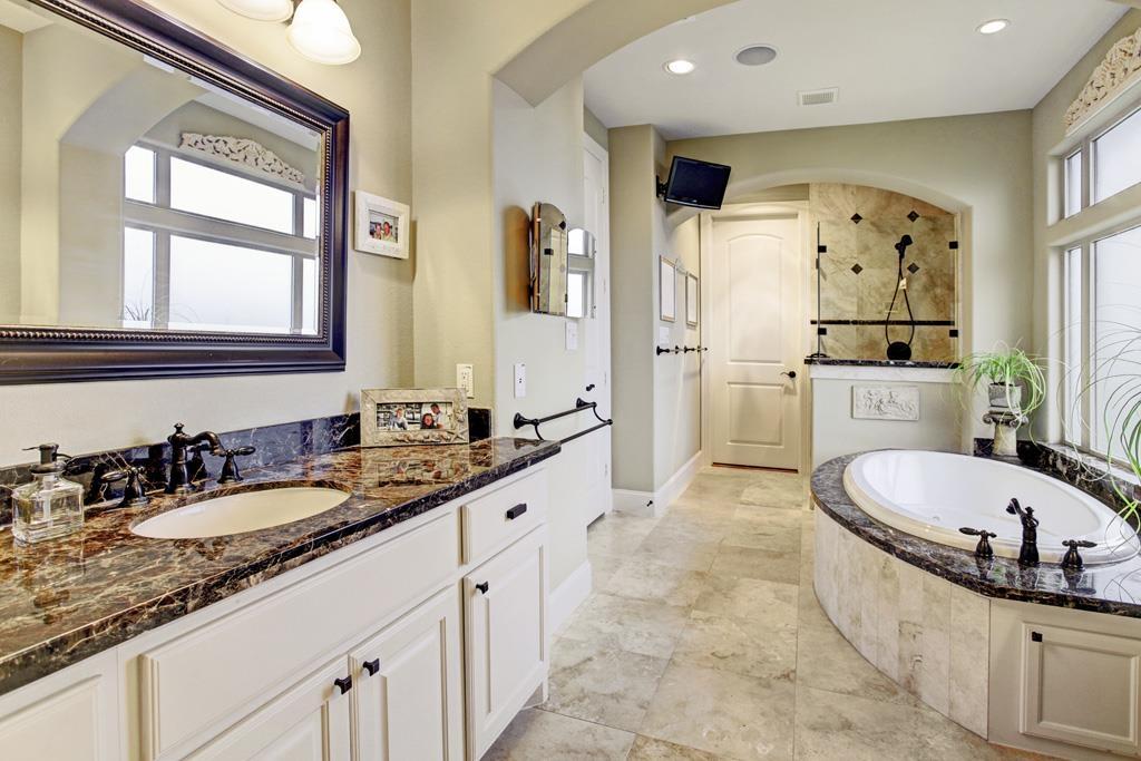 Перед нами проект роскошной и просторной ванной комнаты в загородном доме. Стилистика помещения выдержана в классическом элегантном стиле с преобладанием дорогой отделки в бежево-коричневых оттенках.