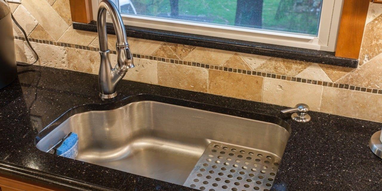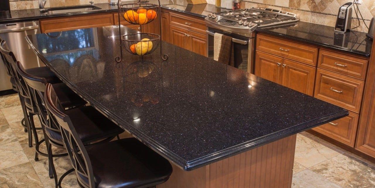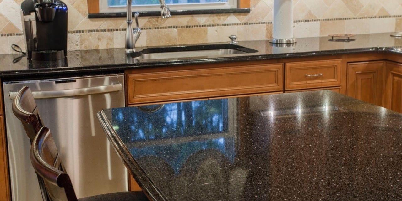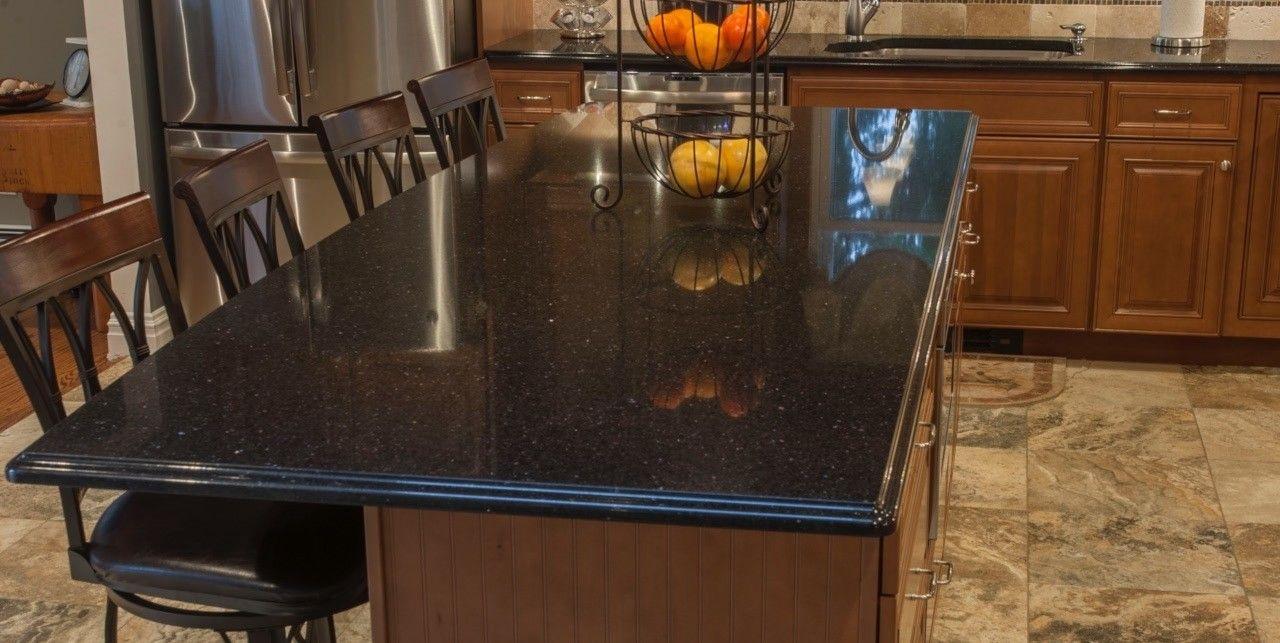 Все кухонные поверхности покрыты черным гранитом (базальтом) Black Galaxy. При удачном распределении освещения камень искрится и мерцает мелкими чешуйками слюды. Камень удачен и с точки зрения физико-химических характеристик - он надежен, долговечен, обладает низкой пористостью.