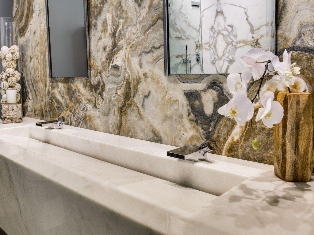 В первую очередь, внимание привлекается стеновой панелью в зоне зеркал. Она выполнена из двух цельных слэбов мраморного оникса Onyx Black Cloud с узорчатым рисунком в серо-бежевой цветовой гамме.