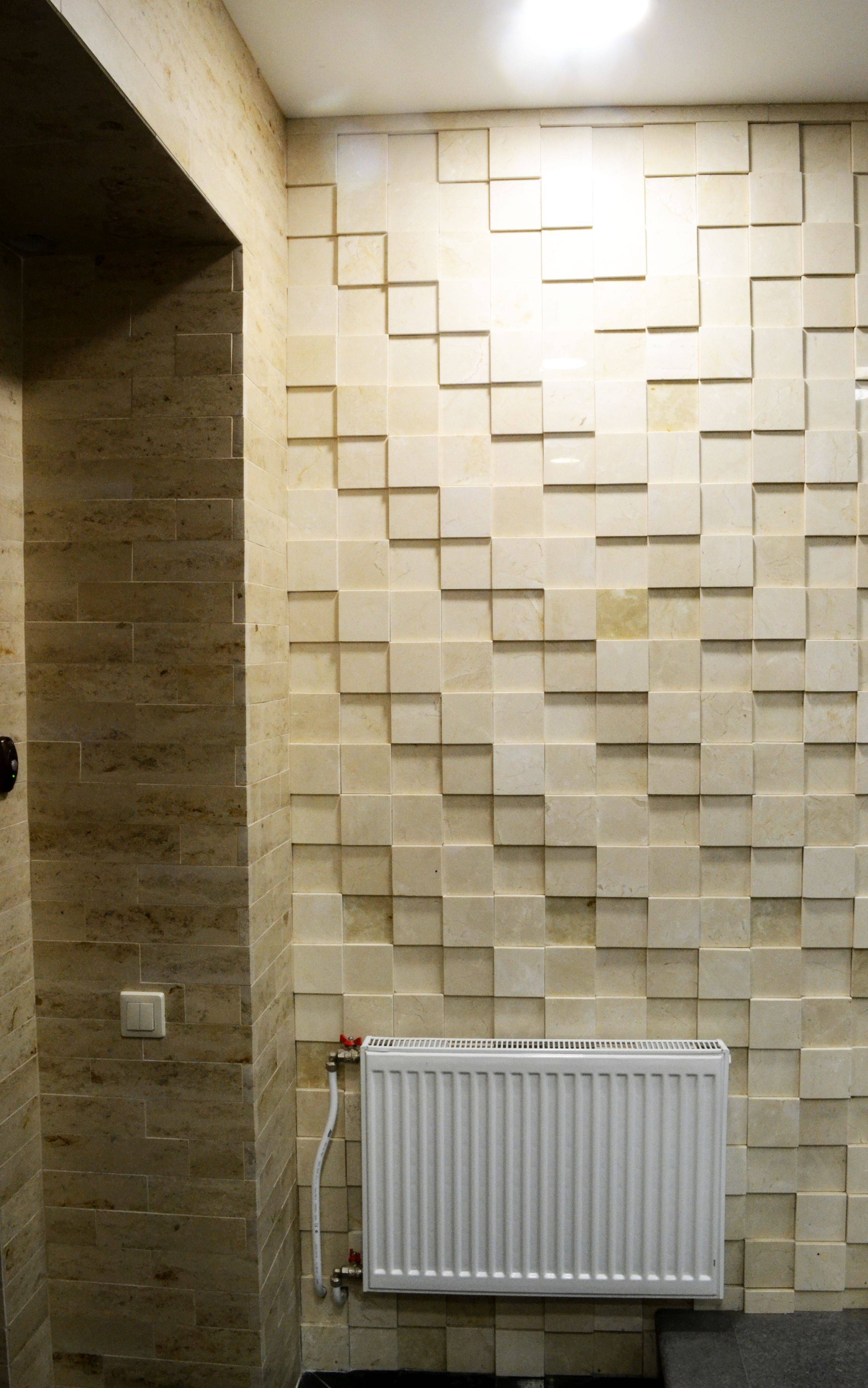 Как правило, чем спокойнее цветовая текстура камня, тем лучше. В данном случае наши мастера очень удачно выбрали материал - кремово-бежевый мраморизованный известняк Crema Marfil. Камень с полированной фактурой создает игривое мерцание квадратных прожилковатых плиток.
