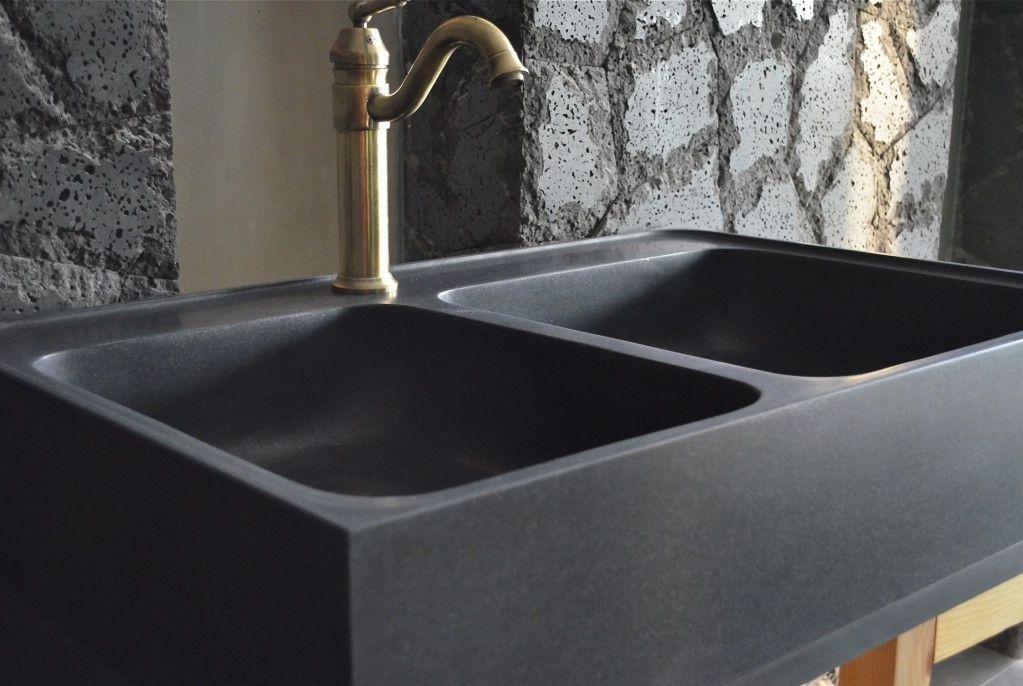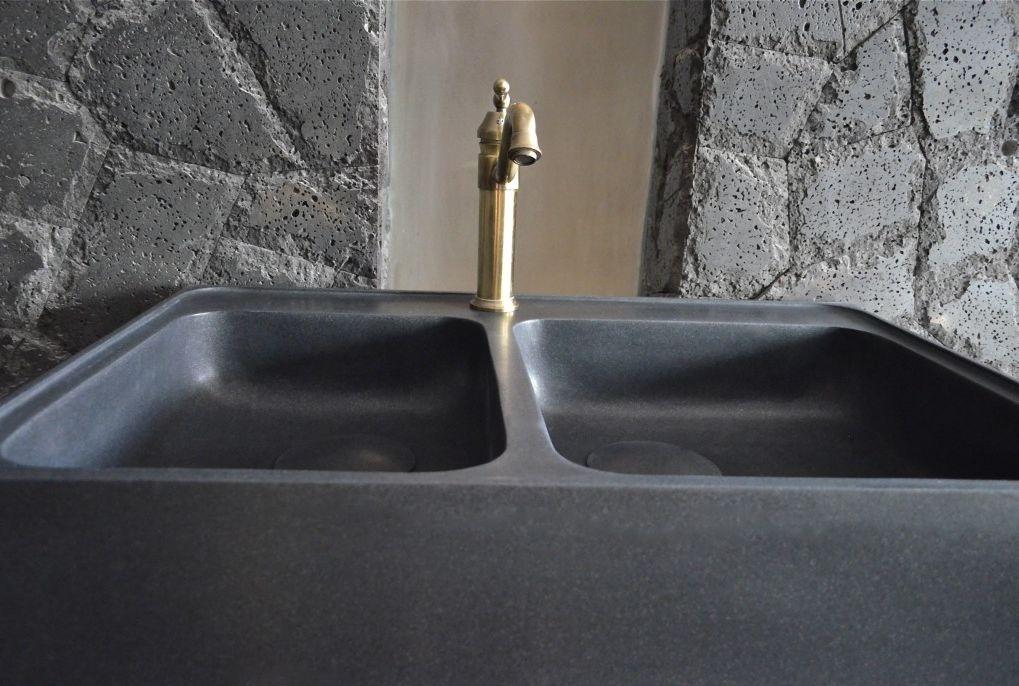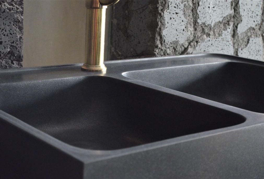 Эта двойная мойка вырезана из толстомера базальта Absolute Black (этот камень также относится к классу черных гранитов).
