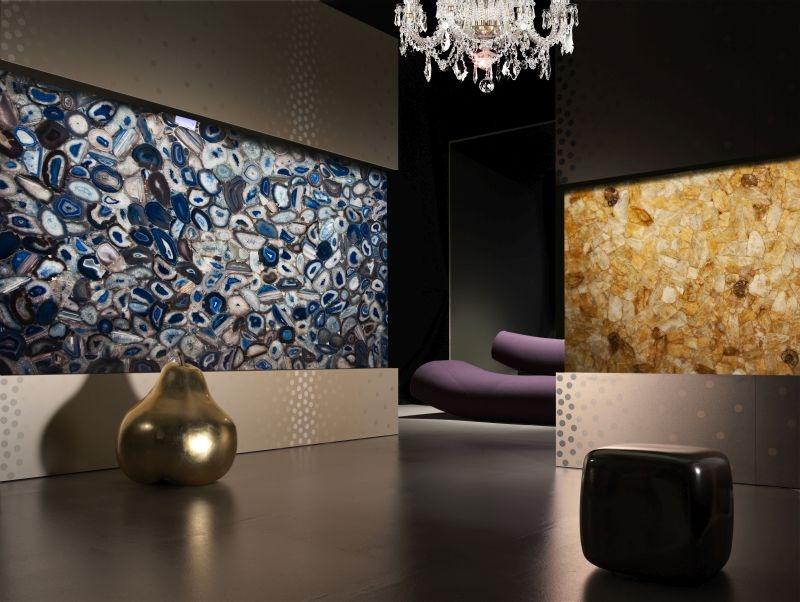 Агат — удивительно яркий камень. Этот проект показывает, что агат сам по себе уже прекрасный декоративный элемент интерьера. Стеновая панель выполнена из сорта Agate Blue. Для схожего эффекта подойдут также Agate Blue Flower и Agate Blue Peahen.