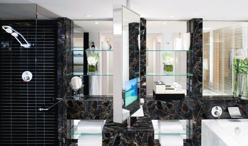 Agate Tobacco играет главную роль в интерьере этой изысканной ванной комнаты. Им облицованы стеновые перегородки, из него выполнены декоративные столешницы и подоконники.