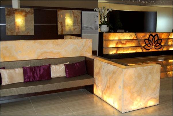 Мраморный оникс Alabastro особенно удачно смотрится в сочетании со скрытой подсветкой. Камень обладает теплым персиково-желтым оттенком, который мягко преобразует излучение светодиодных ламп. Помещение наполняется атмосферой интимности и уюта.