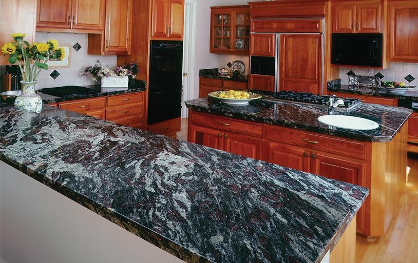 Все столешницы выполнены из удивительного индийского гранита Amadeus - камня с сказочным витиеватым рисунком серых, белых, гранатовых, сиреневых и голубых вкраплений. Фактура поверхности - полировка.