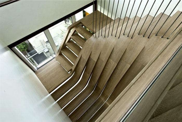 Конечно, ключевым элементом всего пространства - смысловым и связующим, является деревянная лестница. Волнообразная, плавная, "перетекающая". Создается впечатление, что архитектор смог преодолеть природную твердость дерева, сделав его гибким и пластичным, принимающим любую форму, как вода.