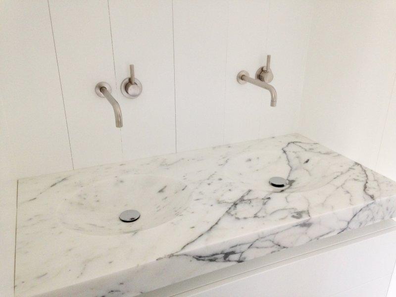 Эта раковина выполнена из толстомера классического итальянского мрамора Arabescato Vagli. В плите вырезаны две неглубокие впадины и отверстия для слива воды. Фактура поверхности камня - лощение - бархатистое, без блеска. Перед эксплуатацией изделие было обработано профессиональной гидрофобной пропиткой, которая защищает его от образования стойких пятен.