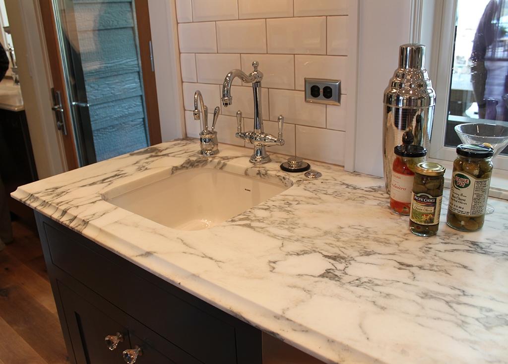 Arabescato Vagli - изысканный итальянский мрамор с четким рисунком темных прожилок. Именно он был выбран для создания кухонных столешниц.