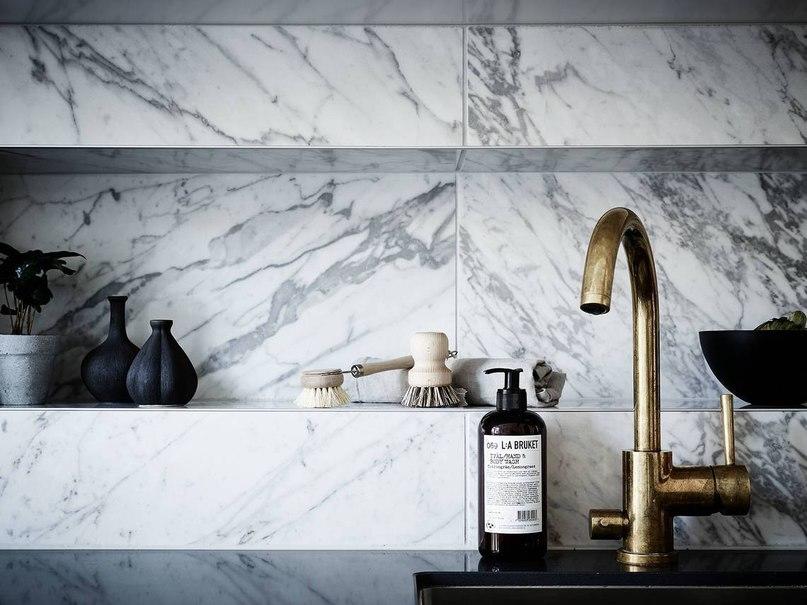 Зона фартука с нишей облицована легендарным итальянским мрамором Arabescato Vagli - белоснежным, с густой сетью широких голубовато-серых прожилок. Диаметральная направленность рисунка придает пространству динамику, наполняя его энергетикой.