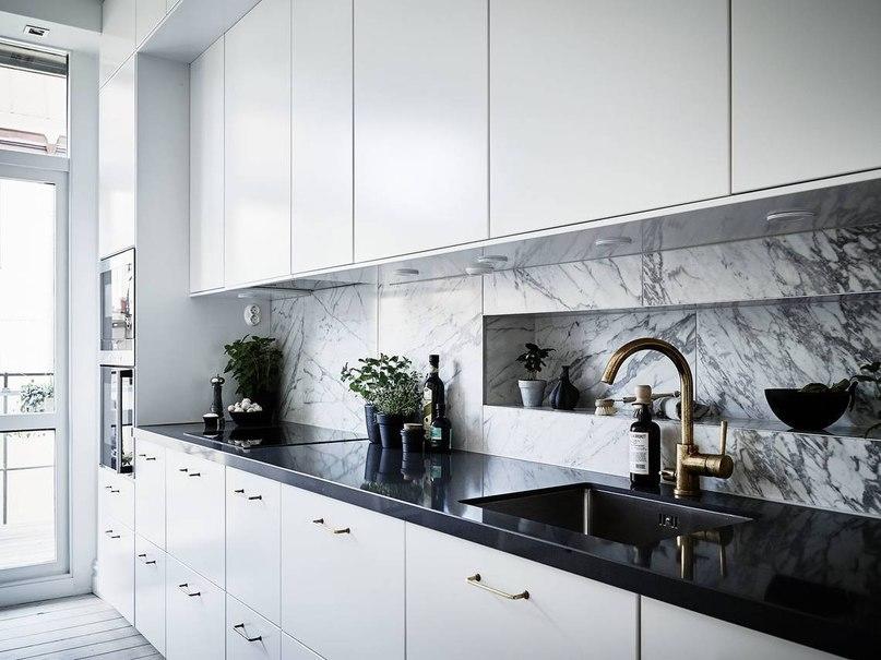 Перед нами проект стильной и лаконичной кухни. Простота и элегантность, внимание к деталям, бело-серая цветовая гамма, - беспроигрышный вариант в современном дизайне. А когда эта идея воплощена в благородном природном камне, проект заметно выигрывает.