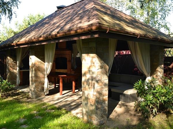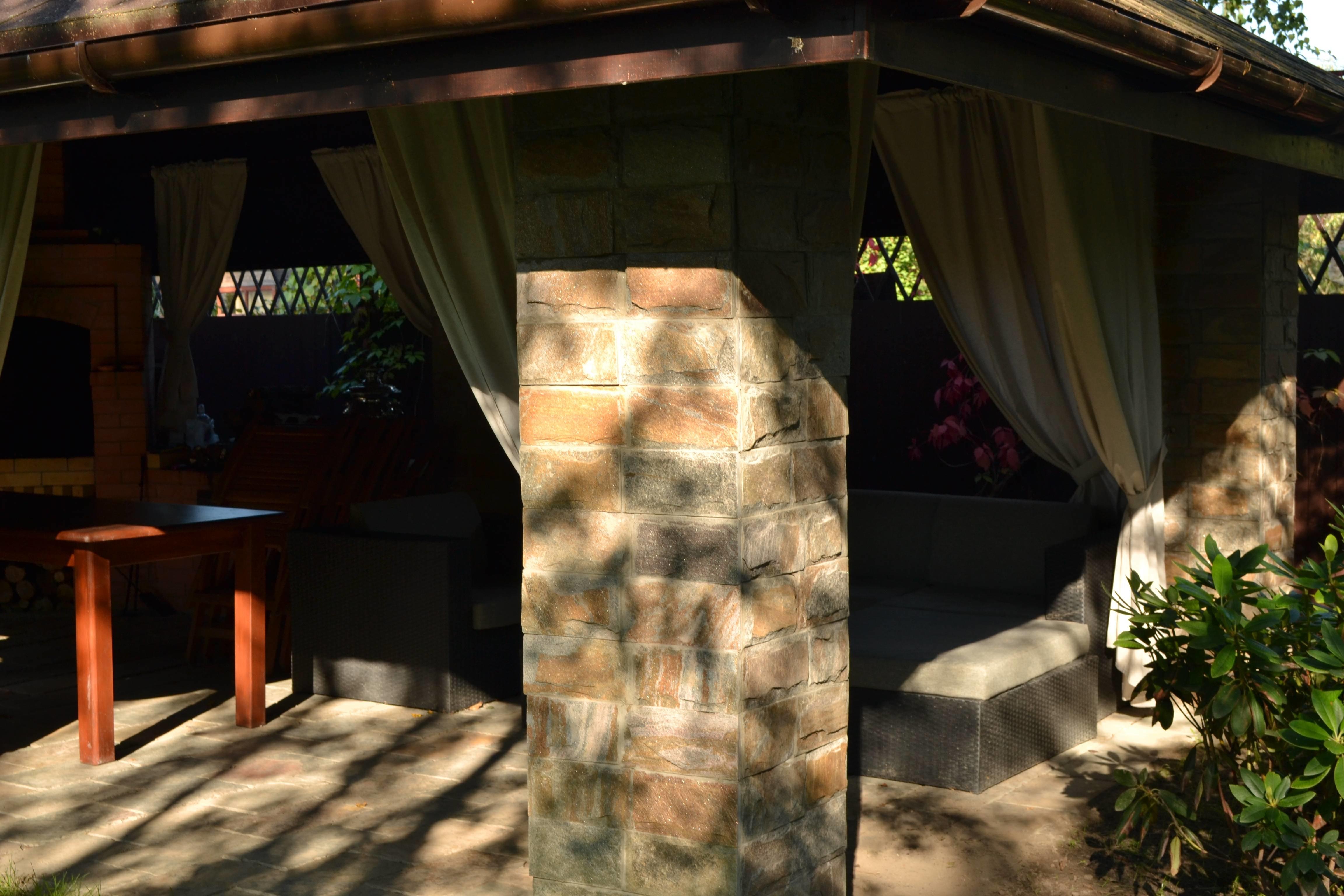 Плиткой кварцитосланца облицованы опорные квадратные колонны. Он же использовался для мощения пола в беседке. Этот камень - один из самых популярных материалов для реализации ландшафтных проектов, поскольку он прекрасно выдерживает любые климатические условия, не истирается и устойчив к загрязнениям и влажности.