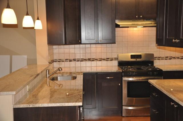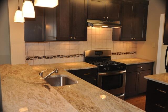 Все столешницы этой кухни вырезаны из полированного гранита Astoria Gold - золотистого камня с волнистым рисунком темных вкраплений. Astoria Gold смотрится естественно и органично, этот камень легко встраивается в проекты любой стилистической направленности.