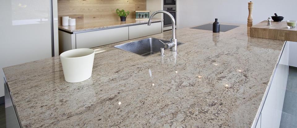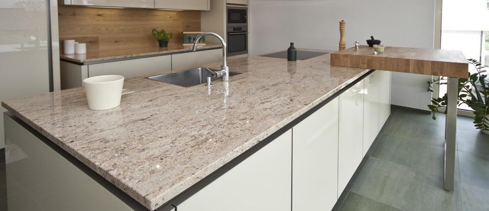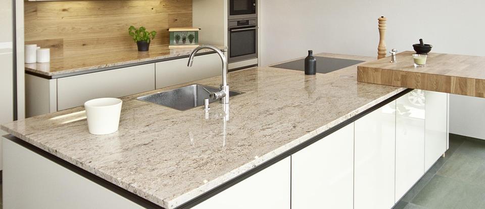 Кухонные рабочие поверхности представляют собой плиты полированного гранита Astoria Gold - привлекательного камня кремового оттенка с полосчатой текстурой.