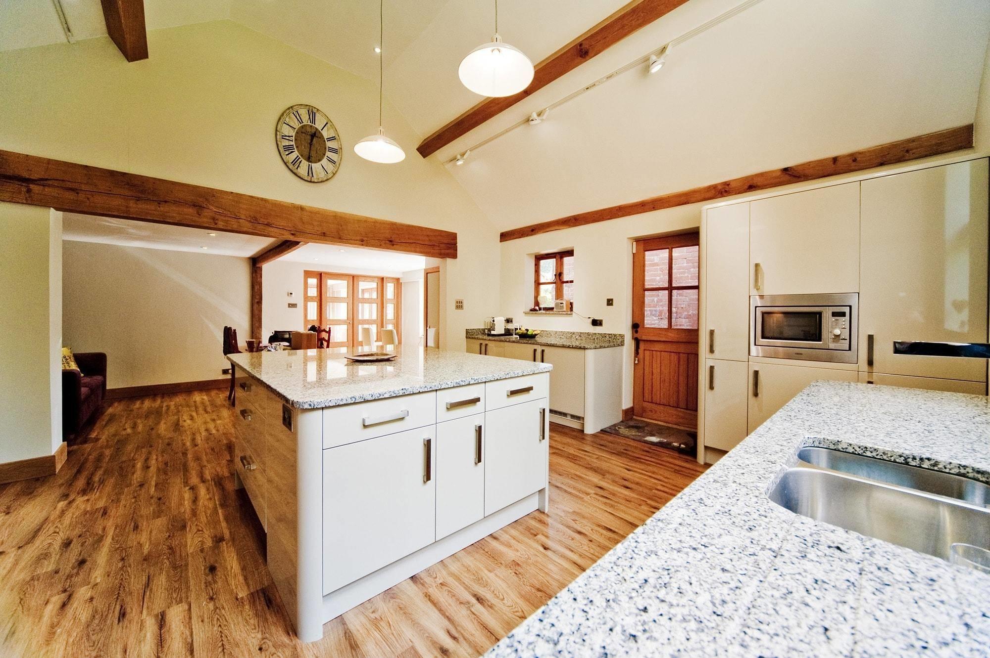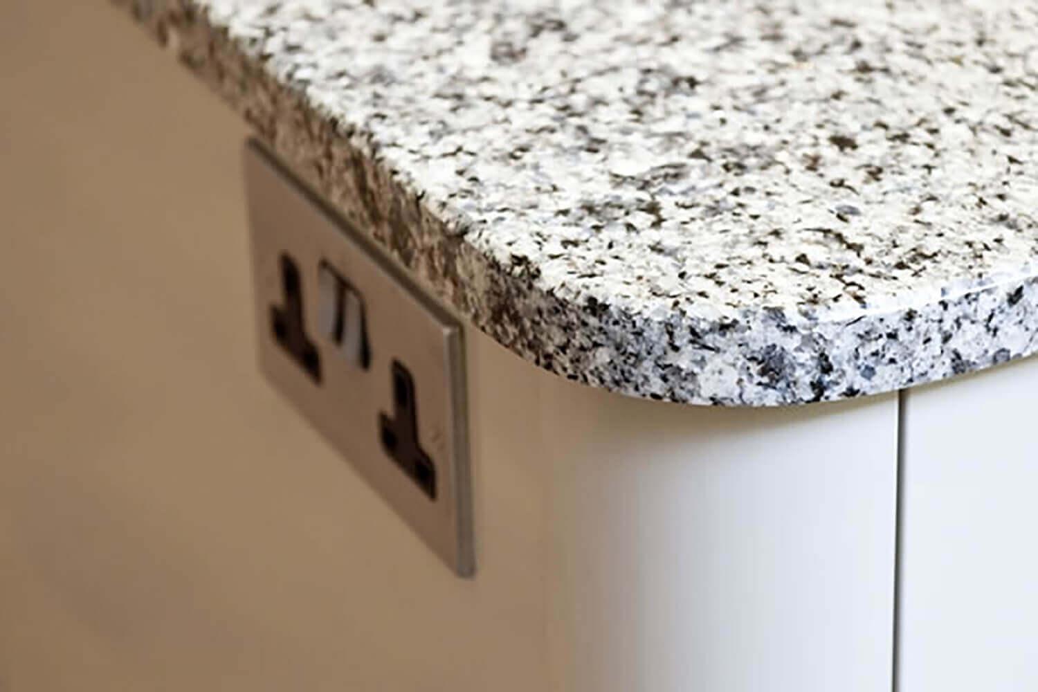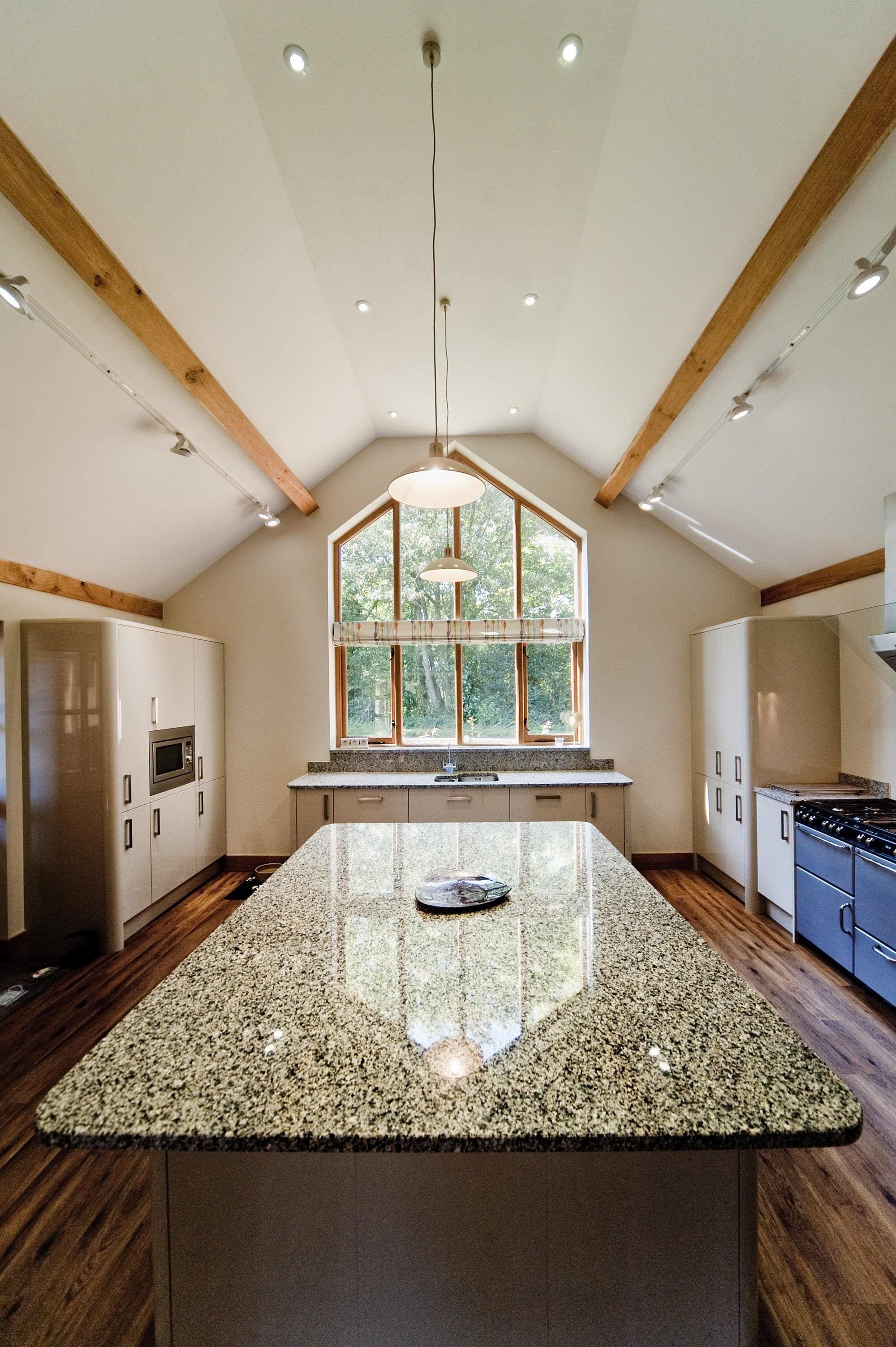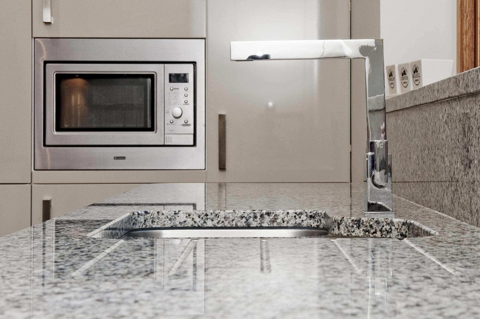 Столеницы этой светлой кухни выполнены из гранита Azul Platino - голубовато-белого с четким и частым рисунком темно-серых зерен. Этим камнем покрыты поверхности рабочей зоны, а также центрального стола. Из него же выполнены невысокие плинтусы, обрамляющие столешницы по стене. У окна каменный плинтус переходит в простой и массивный подоконник.