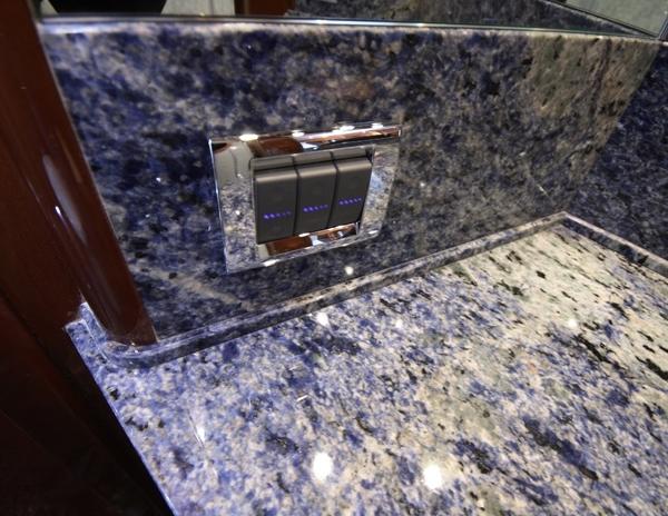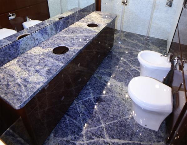 Гранит Azul Bahia придает пространству свежесть и ощущение чистоты, поэтому особенно удачно этот камень смотрится именно в интерьере ванной комнаты.