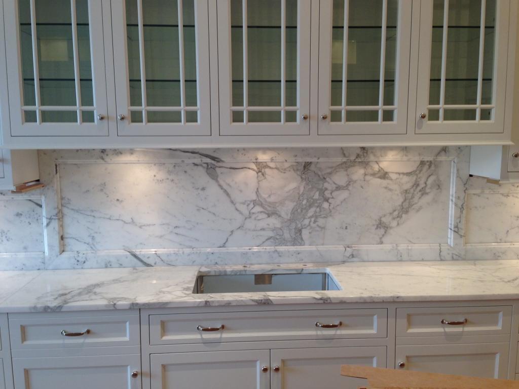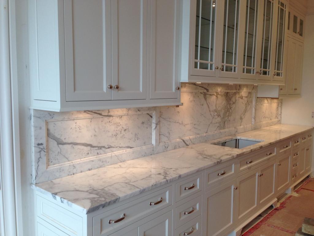 Из этого мрамора выполнен сложный рельефный фартук, изготовленный методом склейки элементов. Из него же вырезаны поверхности двух столешниц.