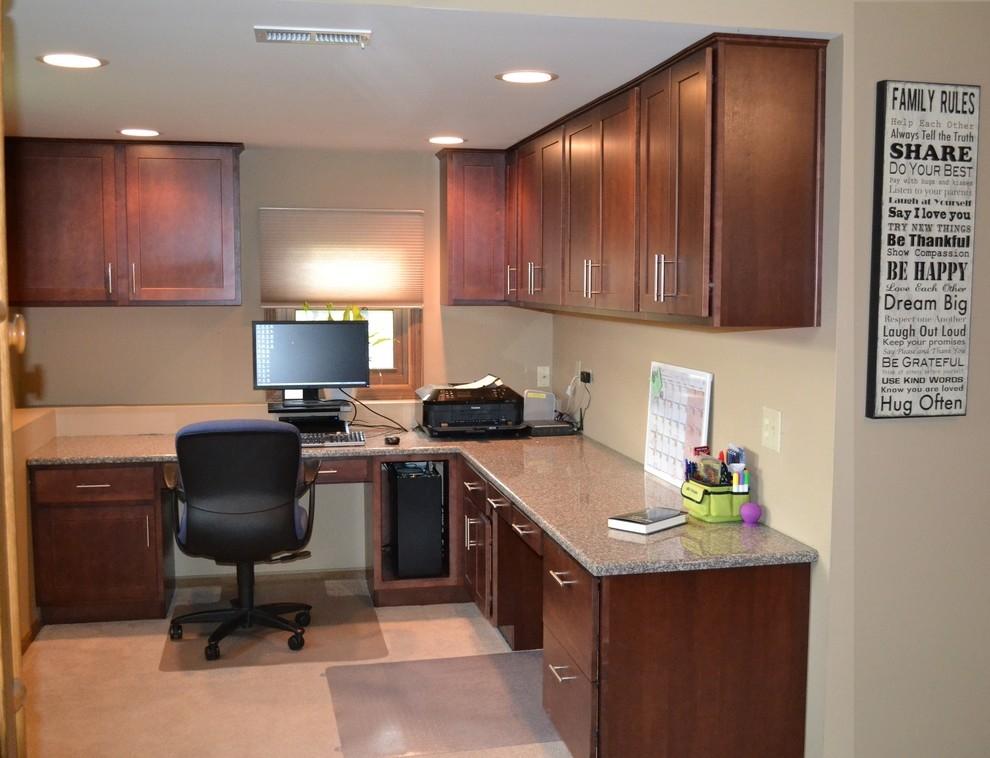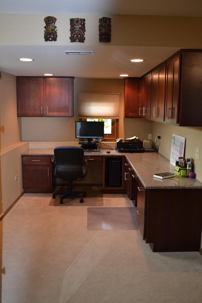 Столешница рабочей зоны этой кухни (которая в процессе переезда пока что играет роль кабинета) выполнена из полированного трехсантиметрового слэба гранита Bainbrook Brown.