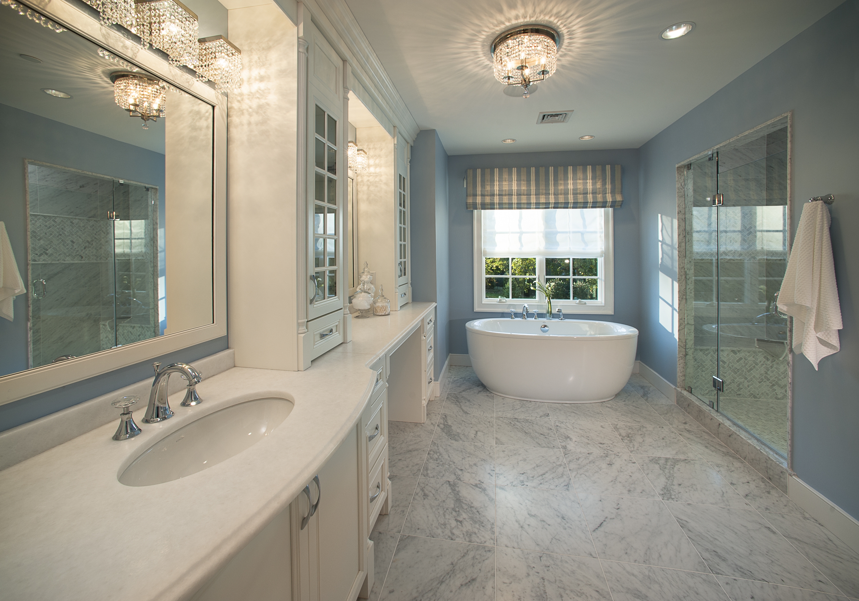Владельцы дома - состоятельная семья с традиционными предпочтениями в дизайне. Проект подразумевал использование мягких пастельных оттенков и отделку классическим светлым мрамором. Выбор почти сразу пал на легендарный Bianco Carrara.