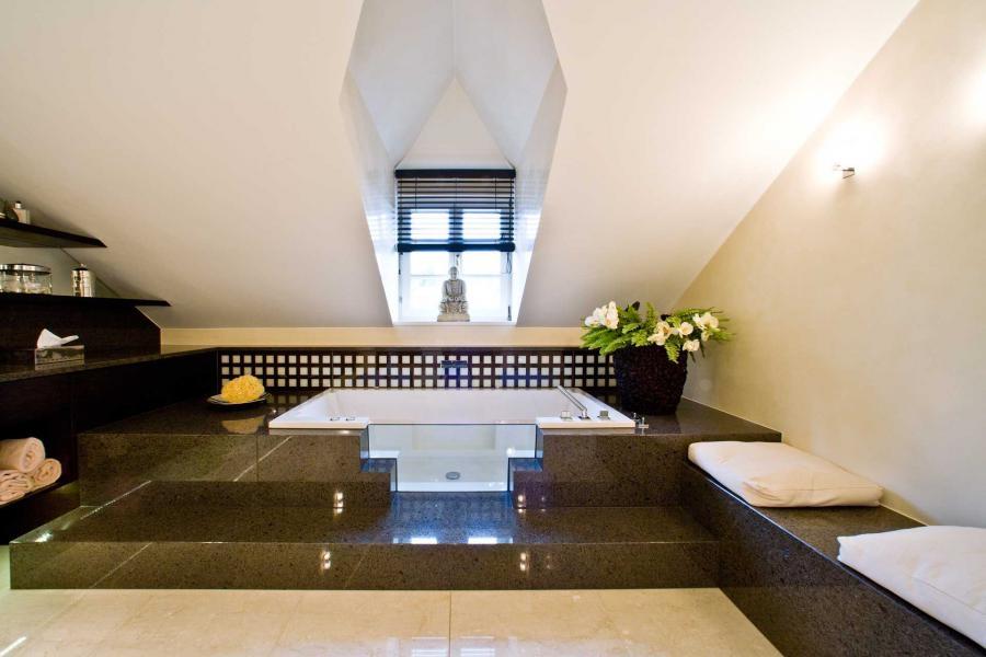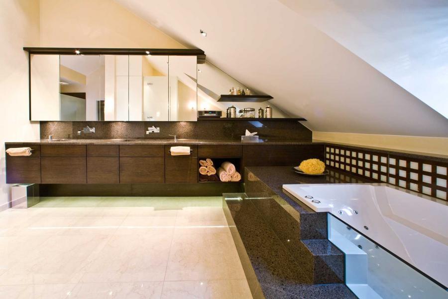 Мы видим проект просторной ванной комнаты, расположенной в мансарде.