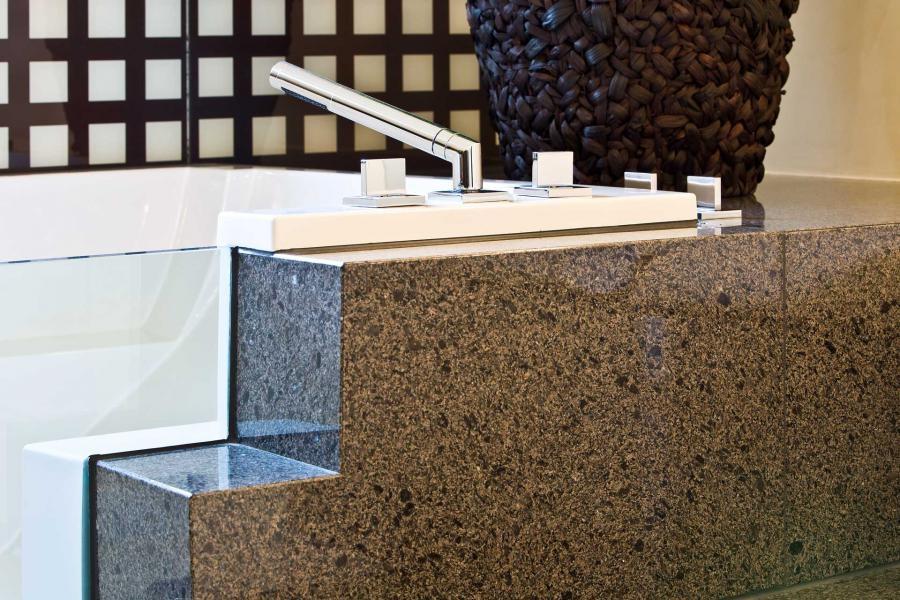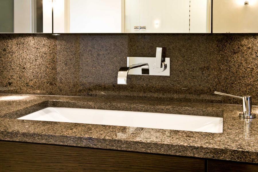 Светлые стены главного помещения контрастируют с гранитом Cafe Imperial, из которого выполнен постамент для ванной, столешницы под раковины и фартуки. Обратите внимание на постамент сложной геометрии: лестничные элементы и полированная фактура заметно повышают презентабельность такого изделия! Скромный, но притягательный рисунок камня смотрится веьсма уместно. Но стоит отметить и его прочностные характеристики - такая отделка вероятнее всего станет многовековой семейной реликвией.