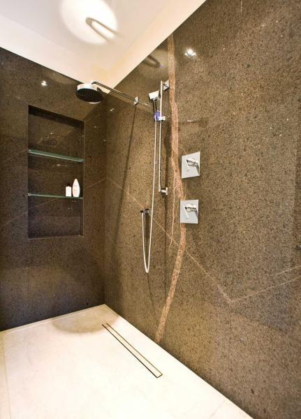 На последней фотографии мы видим отделку душевой кабины - стены целиком облицованы крупными полированными плитами того же камня, включая модные ниши в стене.