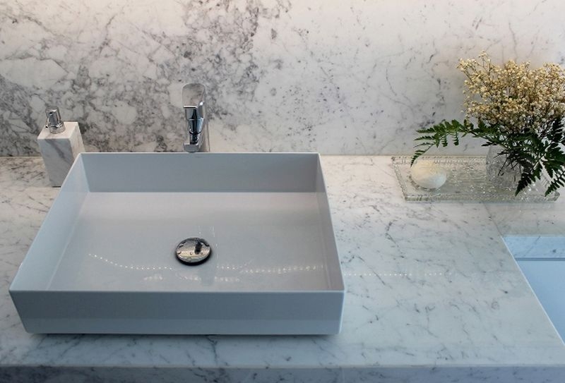 Этот мрамор действительно очень органичен в интерьерах ванной, душевой или бассейна. Но следует заранее снизить риски порчи камня в условиях высокой влажности, а также оградить контакт камня и едких чистящих средств.