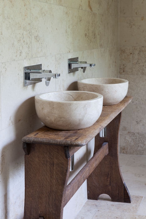 Интересный дизайн ванной во многом объясняется сочетанием материалов: полированного кремового мрамора, грубоватого юрского камня, глянцевого металла кранов и состаренной древесины в качестве столешницы.