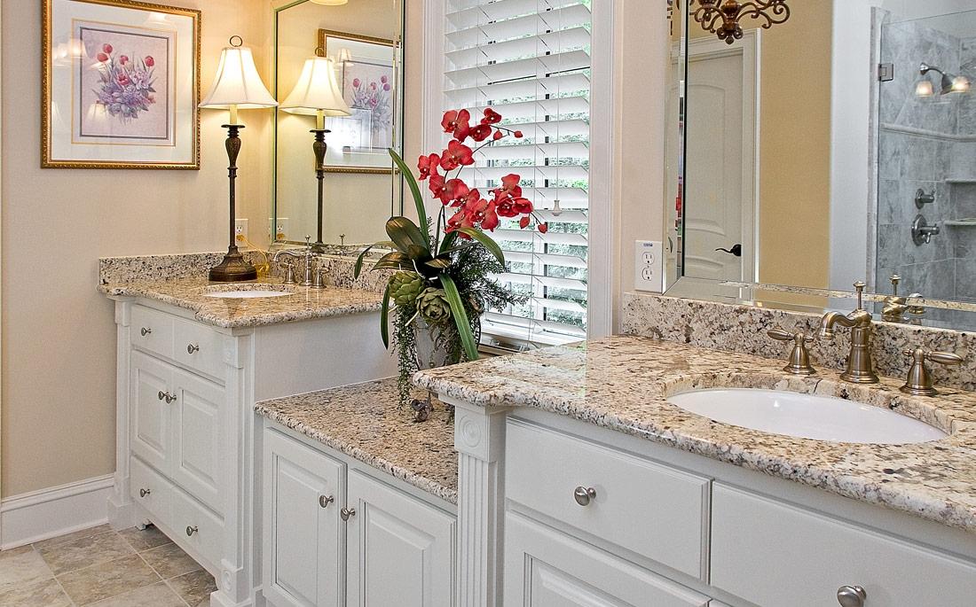 Секрет гармонии интерьера ванной заключен в отточенном классическом стиле. Элегантная белая мебель, бежевые стены и пол, теплое освещение прекрасно сочетаются со столешницами из гранита Bianco Antico. Естественная цветовая гамма камня, динамичный графический рисунок темных прожилок, вишневые включения минерала граната - яркая красота этого камня органична в любом проекте.