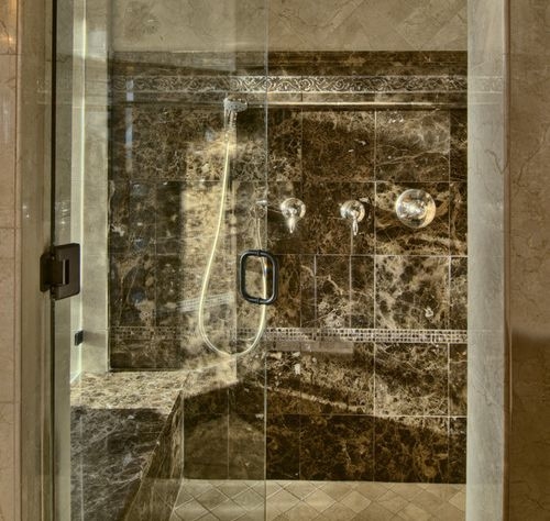 Дизайнер преследовал цель сделать душевую кабину элегантной и необычной. Стены у входа выложены прожилковатым бежевым мрамором Crema Marfil. А стены душевой облицованы плиткой Emperador Dark с элементами мозаики и орнамента. Подоконник-тумба также выполнен из этого сорта коричневого мрамора. Emperador Dark создает впечатление искусно состаренной поверхности, что придает помещению атмосферу роскоши.