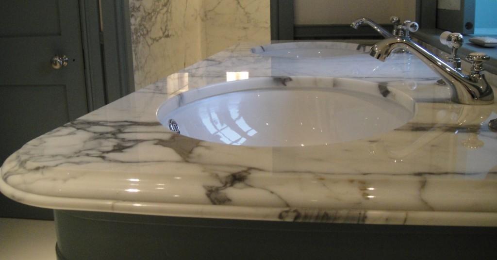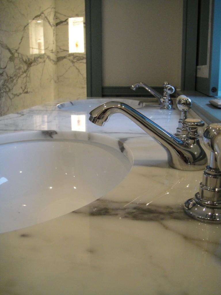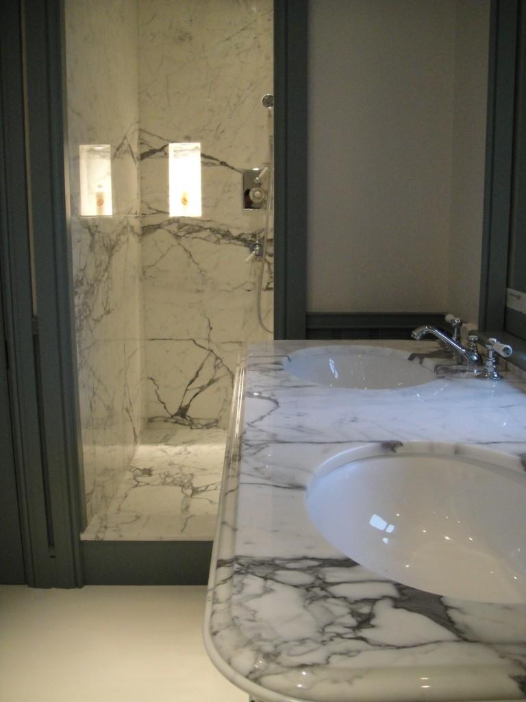 Bianco Statuario использован для создания столешницы под раковины, а также для облицовки стен и пола в примыкающей душевой кабине.