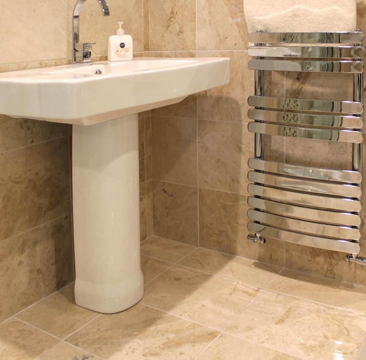 Пол и стены ванной комнаты отделаны полированной плиткой мрамора Cappucino. Этот камень органичен в любом проекте и весьма самодостаточен.