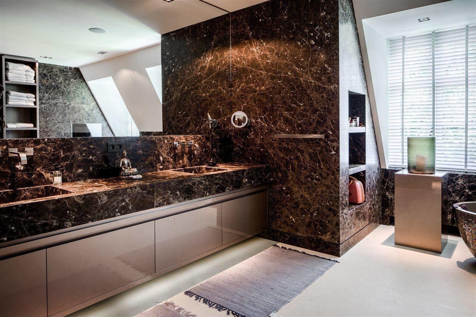 Главным декоративным элементом этого проекта является повсеместная облицовка элегантным мрамором Emperador Dark. Прожилковатая текстура камня шоколадной гаммы смотрится выразительно и благородно. Лощеная поверхность приобрела вид изысканной состаренности.