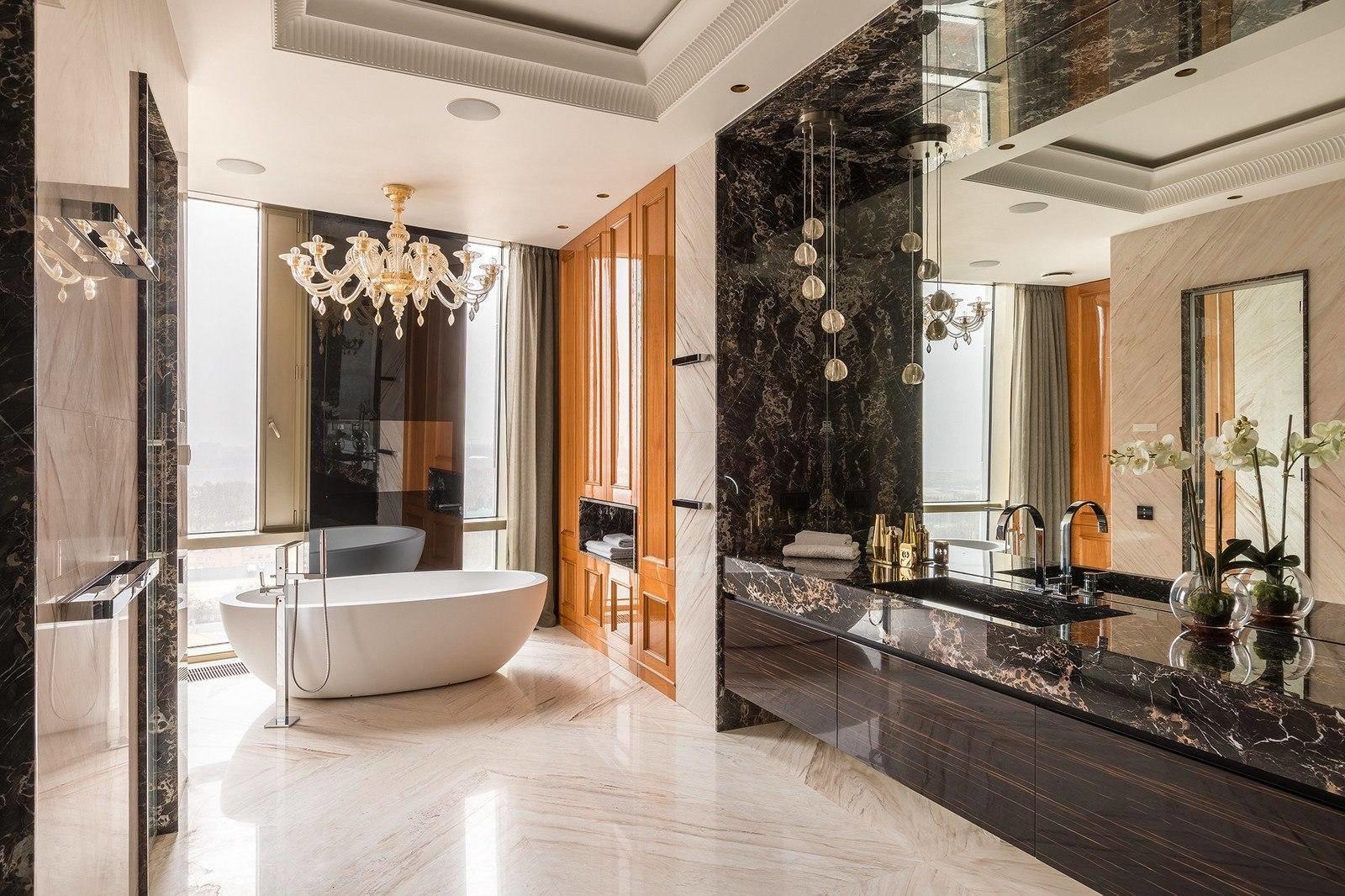 Перед нами уникальный авторский проект московских дизайнеров. Заказчик интерьера - человек с широким кругозором, вдохновляющийся интерьерами лучших отелей по всему миру. Пытаясь воссоздать роскошь пятизвездочных отелей, дизайнер обращался лишь к дорогим сортам камня и дерева и заказывал мебель люксовых марок.