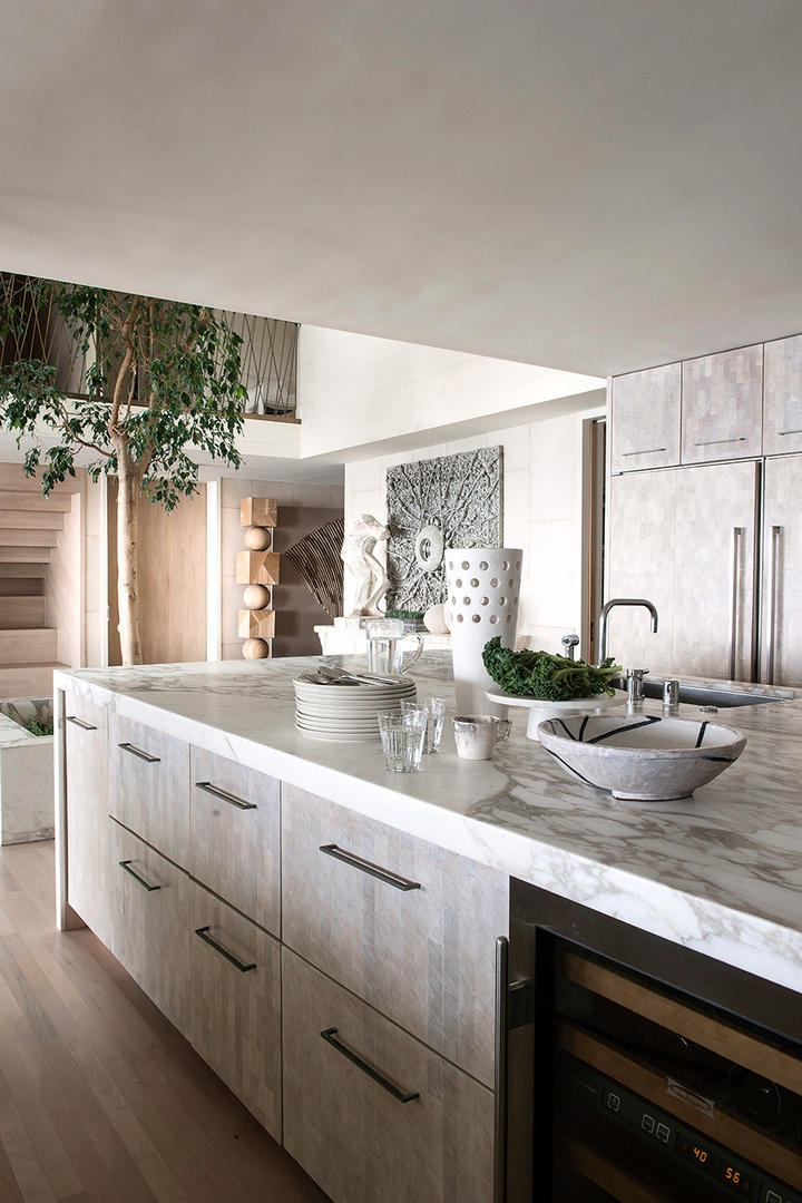 Столешницы на кухне и в гостиной покрыты востребованным и привычным для глаза мрамором Calacatta Vagli — белоснежным с рисунком-сетью из серых прожилок.