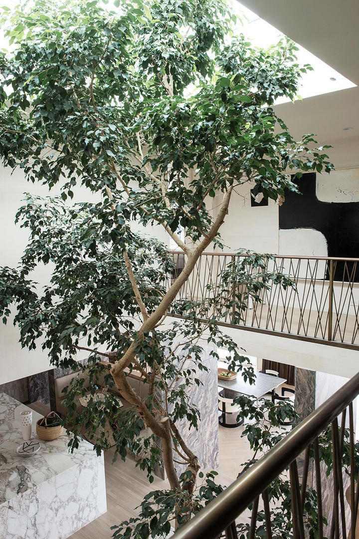 А особенно фундаментально и продуманно смотрится массивный каминный портал из мрамора Arabescato Orobico Grigio. Он занимает сердце гостиной и простирается почти от пола до потолка. Обрамляя каминную топку снизу портал разрастается, фрагментарно выдаваясь в объемное сооружение. Портал склеен из множества элементов, карнизов, рам. Это поистине произведение искусства, воплощенное в редком итальянском мраморе. Этим же камнем облицованы крупные прямоугольные колонны-панели.