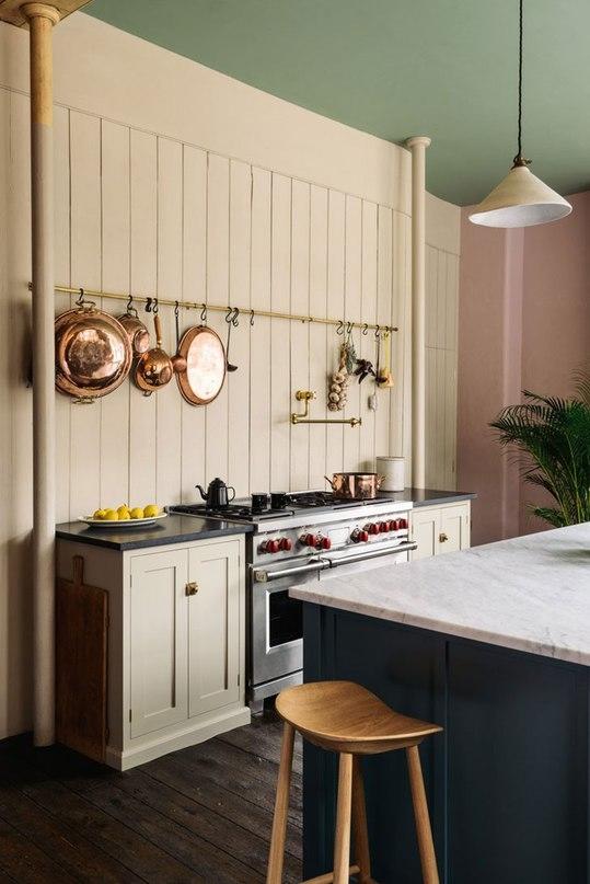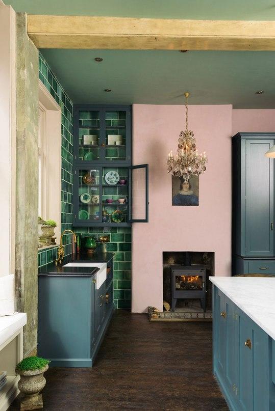 Перед нами оригинальный проект кухни. Она завораживает необычной цветовой гаммой, а также сочетанием разных стилистических направлений. Элементы сельского стиля гармонируют с довольно помпезными аксессуарами.