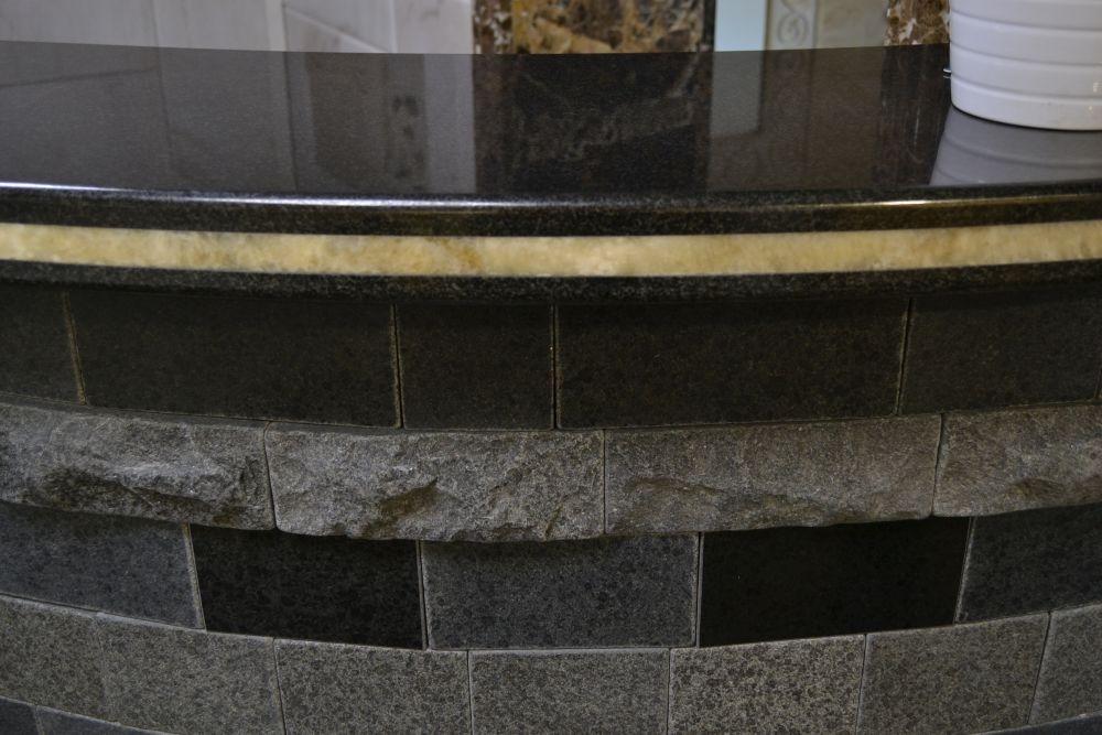 Сама поверхность столешницы собрана из двух плит полированного гранита Berry Black и расположенного посередине слоя мраморного оникса Miele.
