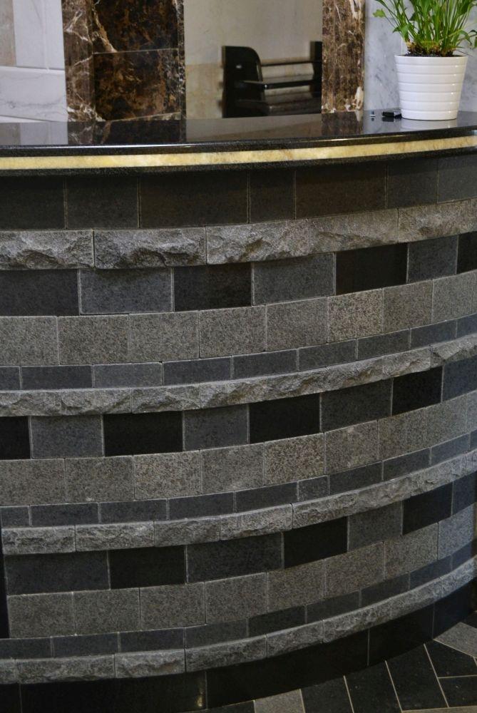 При входе в наш офис Вас встречает необычная стойка-ресепшн, облицованная природным камнем.
