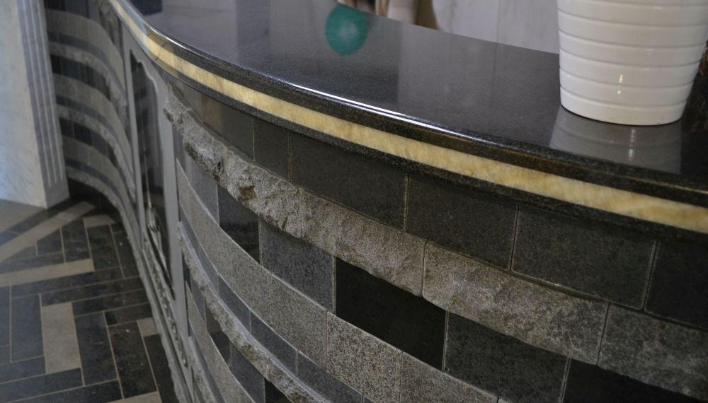 Главную роль здесь играет китайский базальт Berry Black. Из него изготовлена изгибающаяся полированная столешница, им же облицован фасад стойки. Для отделки фасада использовался камень с разными фактурами: колотый, шлифованный, термообработанный, потертый щетками.. Стойка прекрасно демонстрирует то, насколько вид камня зависит от обработки поверхности. К примеру, цвет базальта Berry Black может варьироваться от светло-серого до интенсивно-черного.