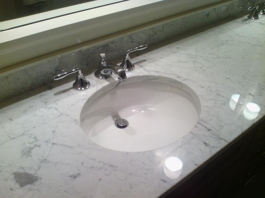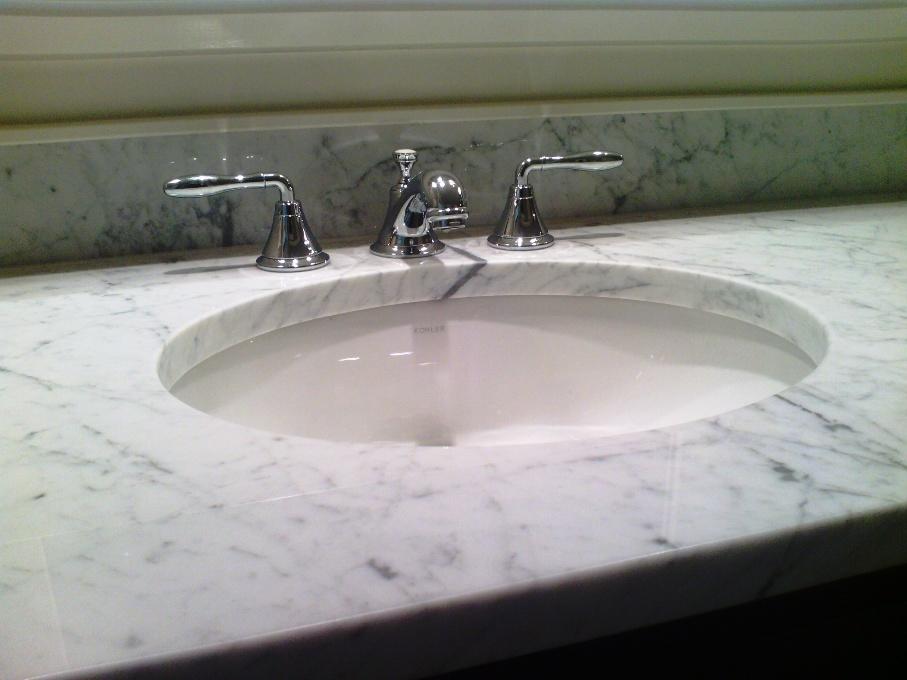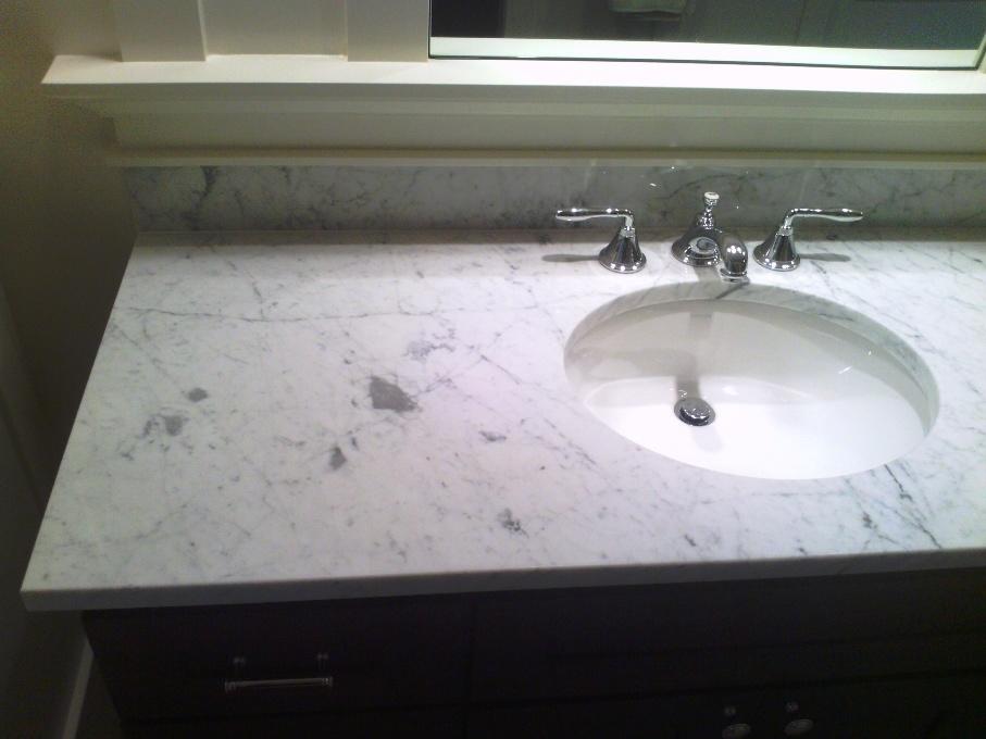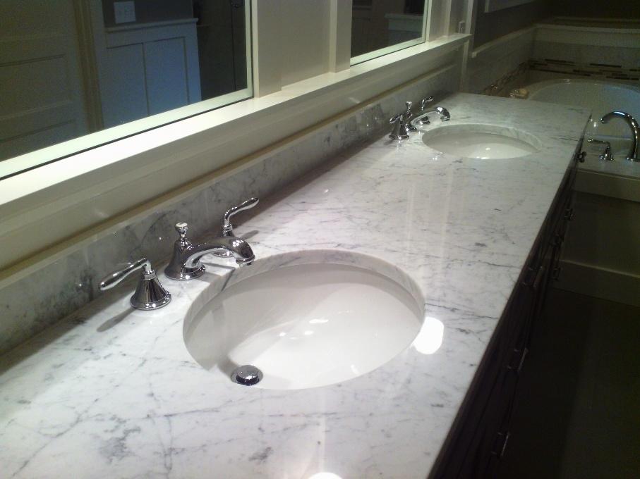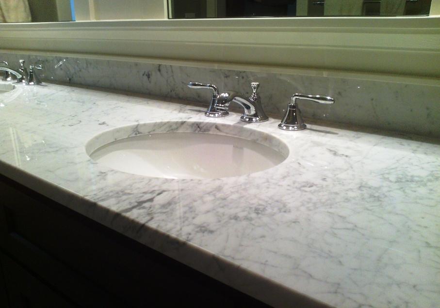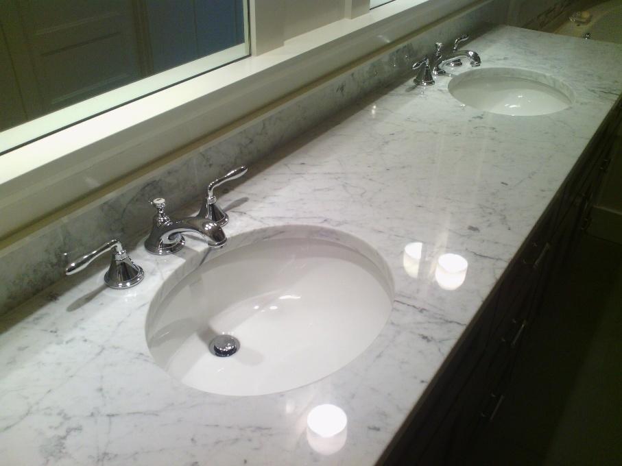 Столешница вырезана из цельного слэба полированного мрамора толщиной 30 мм. Она вмонтирована без стыков, торцевой профиль - классический прямоугольный. Следует отметить и невысокий (15 см) фартук, выполненный из того же камня.