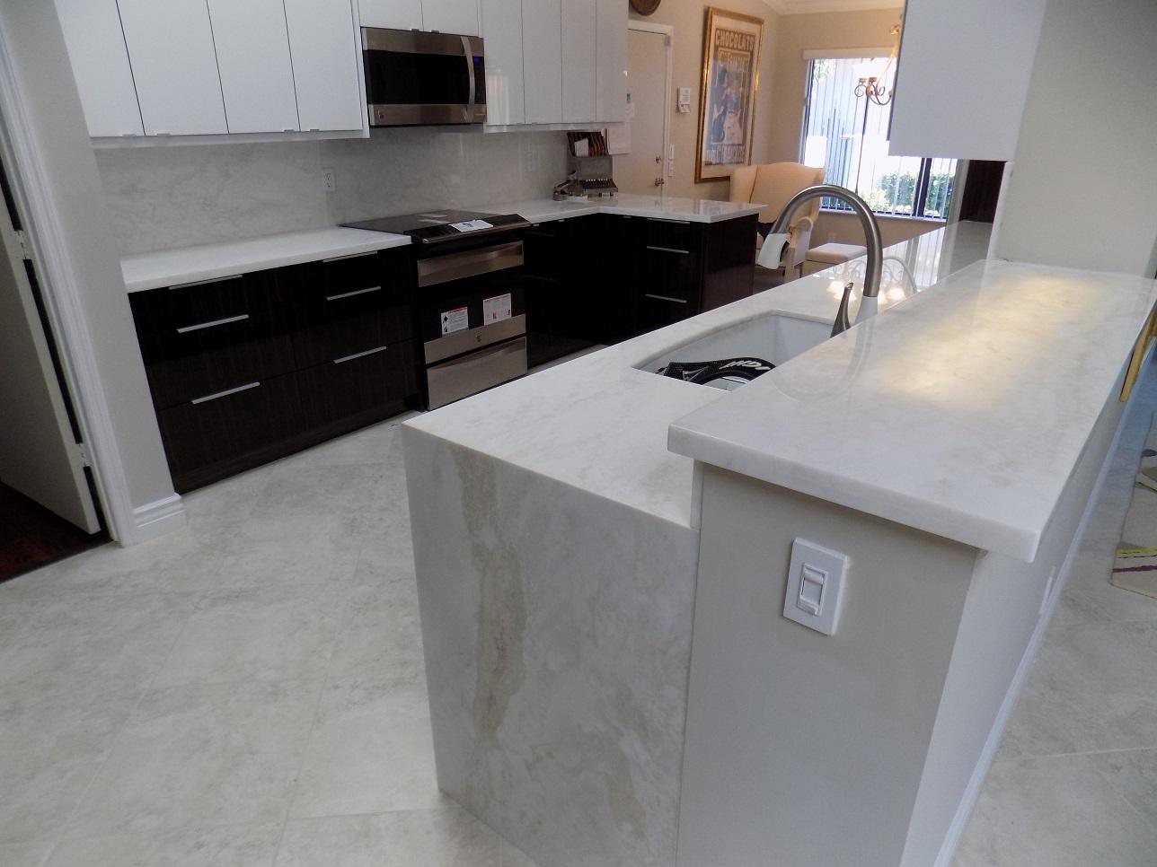 Для облицовки рабочей зоны был выбран необычный камень - мрамор Bianco Namibia. Необычен он в силу своих кристаллических особенностей - он немного полупрозрачен, похож на мраморный оникс с разводами в холодных голубовато-зеленых тонах.