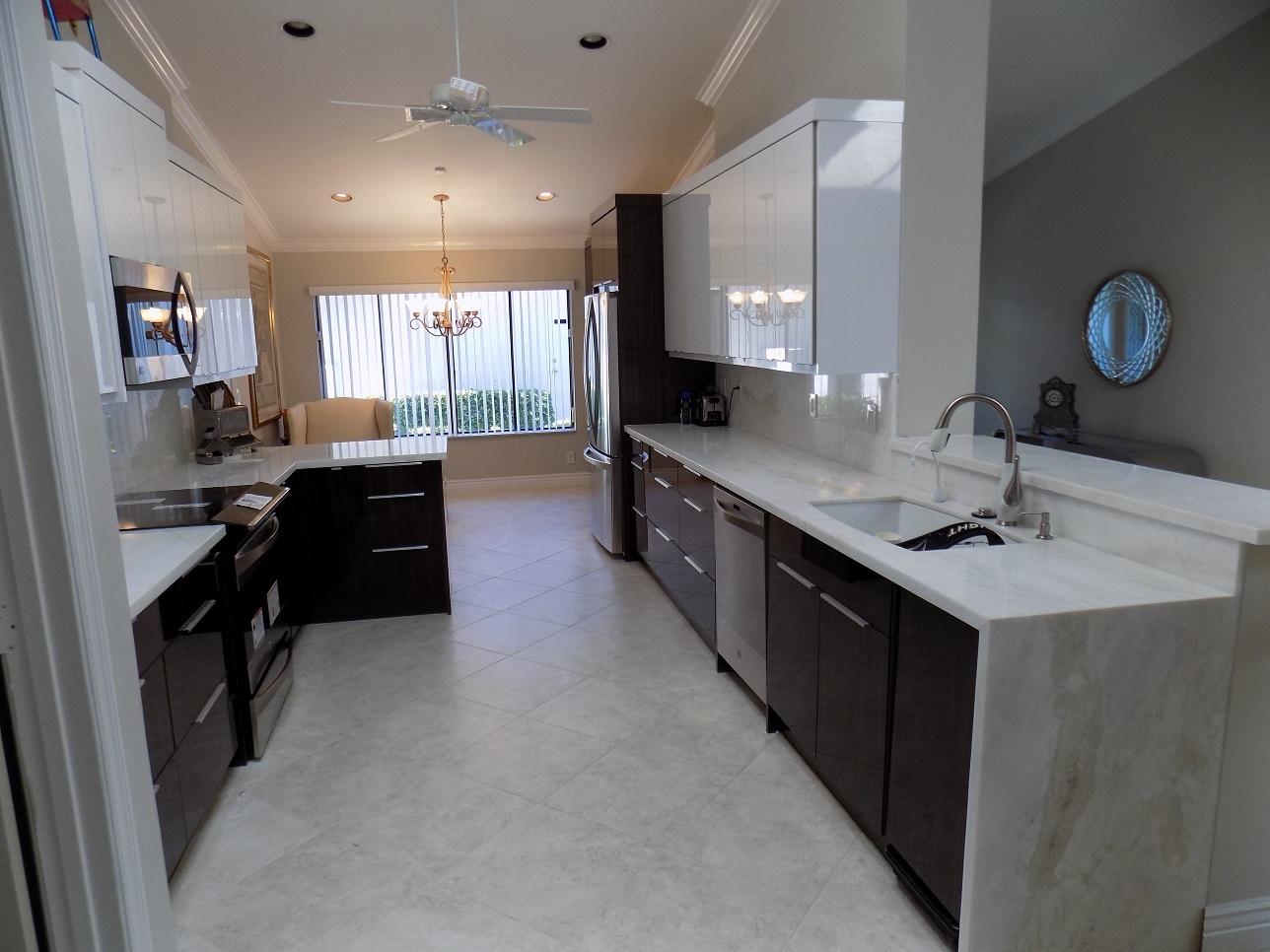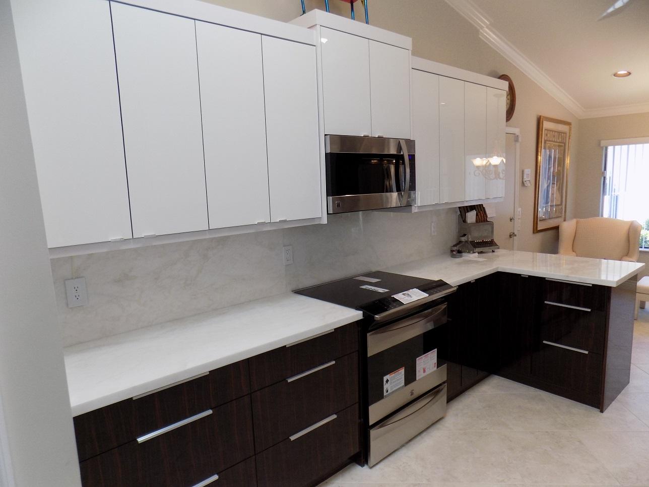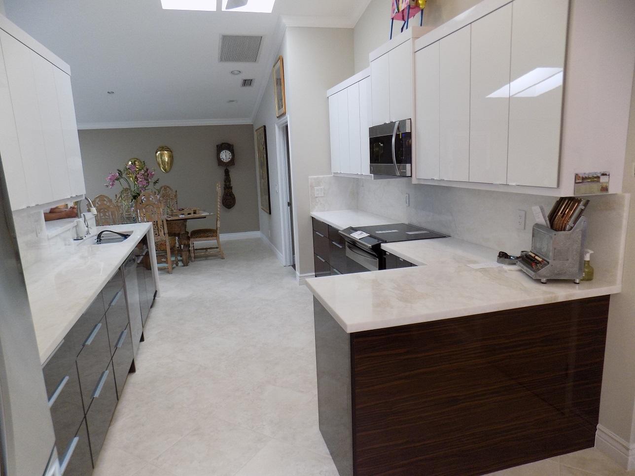 Перед нами проект светлой просторной кухни в современных апартаментах. Заказчик выбрал скромный и эргономичный дизайн в классическом стиле. Мебель из темного дерева сочетается с белыми и светло-серыми тонами отделки.