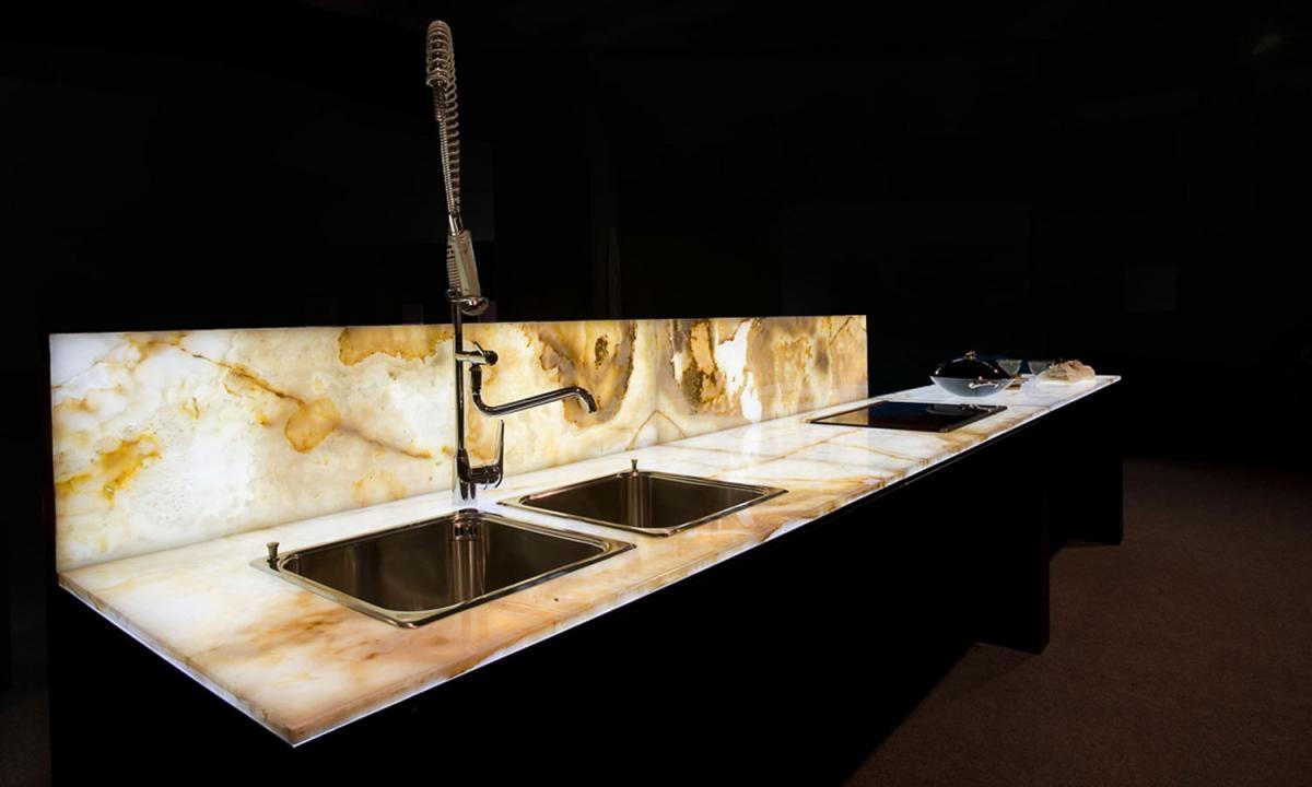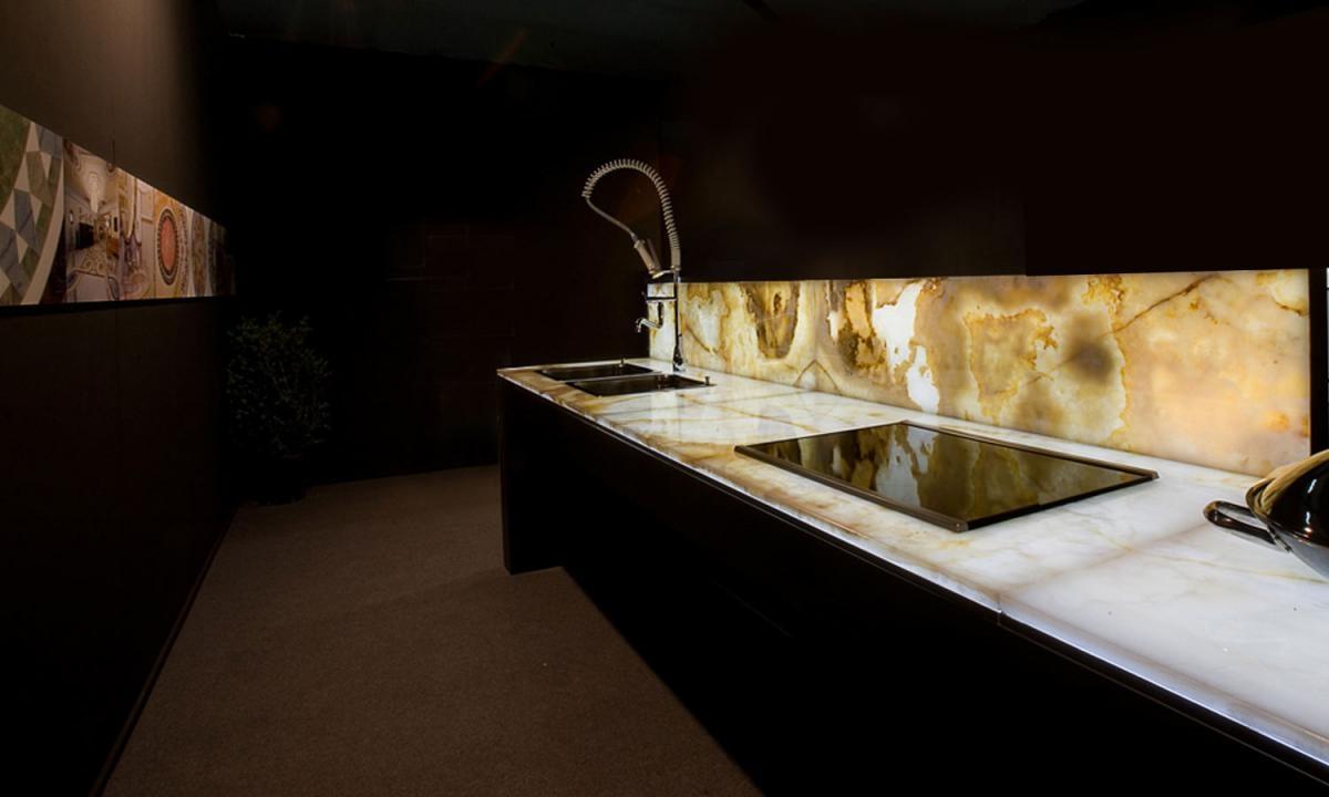 Из мраморного оникса Onyx Bianco выполнены все столешницы для рабочей зоны, им же облицована зона фартука. Подсвеченные панели особенно привлекательны на контрасте с окружающей отделкой в темных тонах.