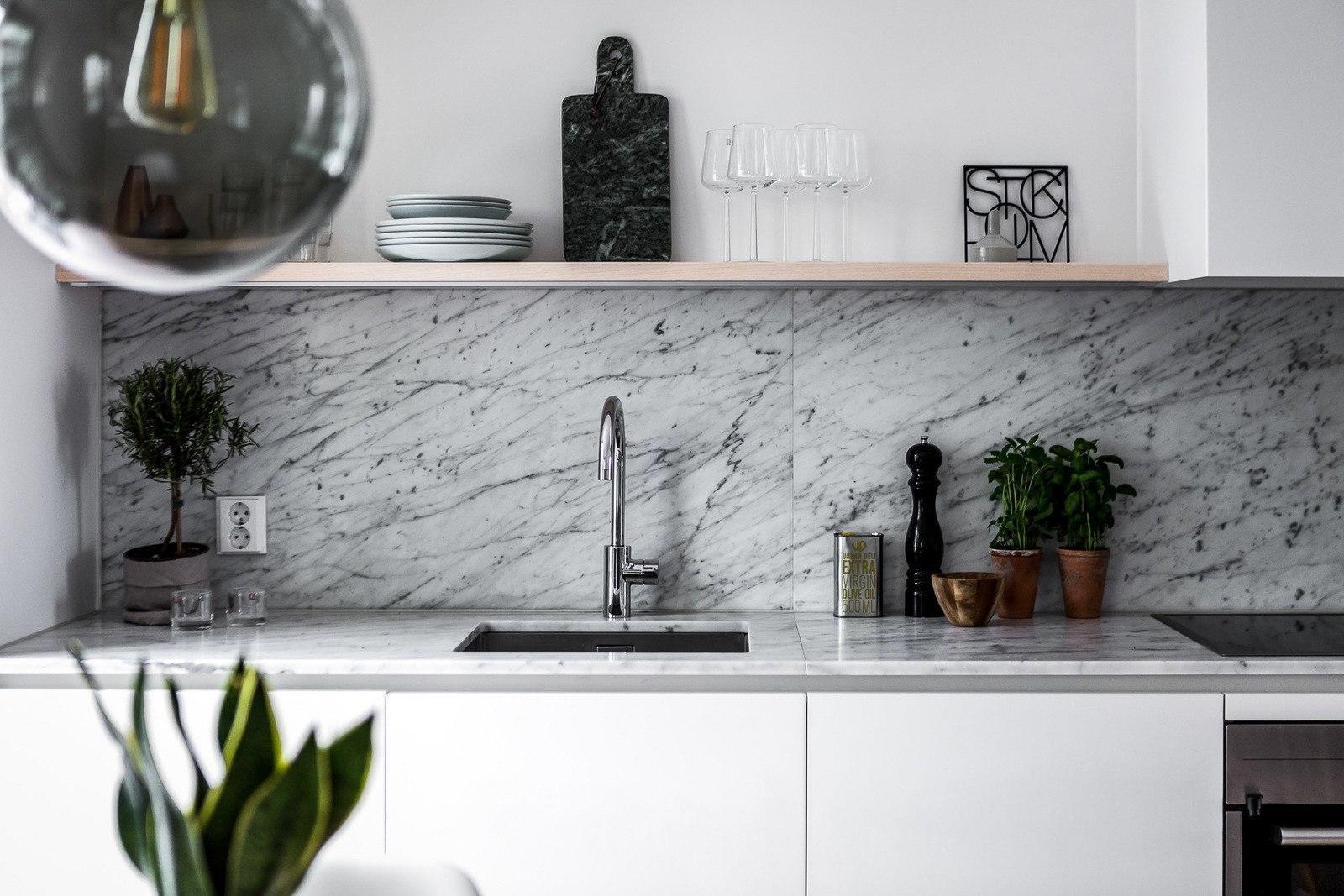 Рабочая зона привлекает особое внимание. Притягивает текстура мрамора - белого, с выраженными жилками и пятнышками темно-серого цвета. Этот камень был добыт на известном каррарском месторождении в Италии. Камень, использованный в этом проекте, называется Bianco Carrara Gioia, и является одним из самых ценных сортов.