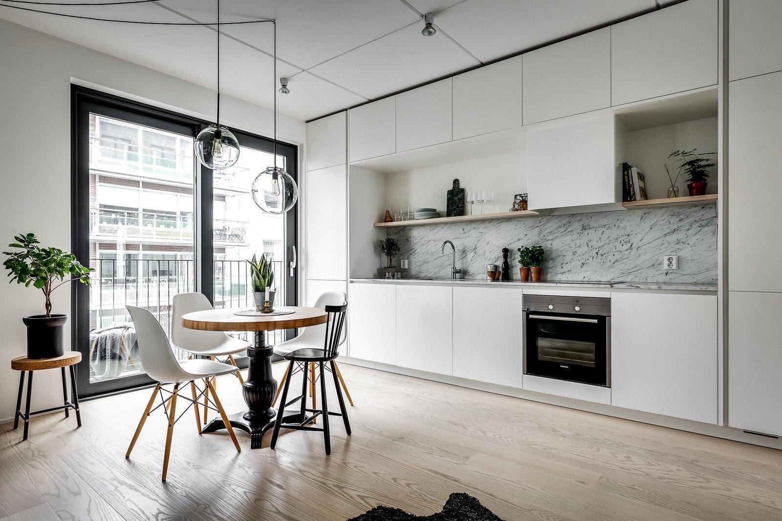 Перед нами современный проект квартиры-студии, воплощенный в модном скандинавском стиле. Простота линий и лаконичность дизайна обогащаются за счет качественных материалов отделки.