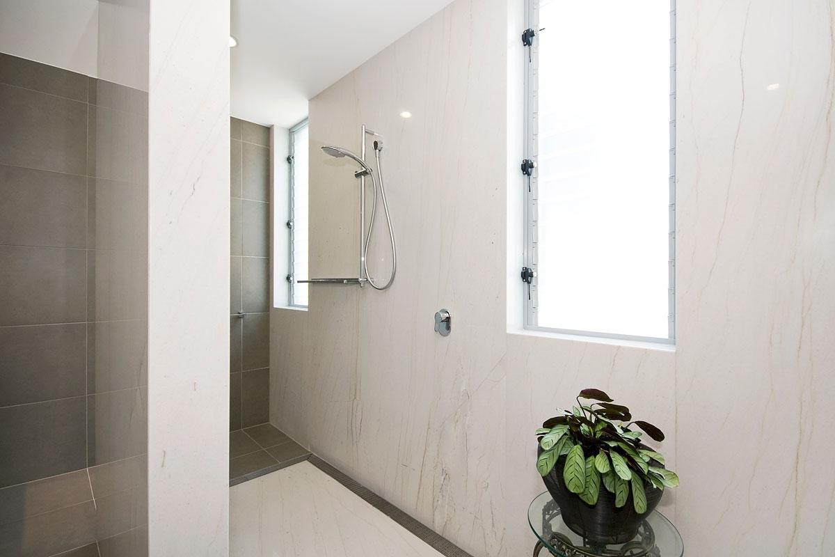 В отделке были задействованы и керамическая плитка, камень, стекло, металл и фарфор. Но нас, конечно, в большей степени привлекает белоснежный сияющий камень с легкими прожилками, которым облицована одна стена и стеновая панель, отгораживающая душ. Этот камень носит название Bianco Macaubas. Он высоко ценится архитекторами, дизайнерами и самими заказчиками. Bianco Macaubas обладает характерным для мрамора видом - белый, немного мерцающий, с прожилками. Но он относится к категории кварцитов, что говорит о его потрясающих прочностных особенностях. Как известно, кварцит достойно противостоит повышенной влажности, истиранию, средствам бытовой химии. За счет его низкой пористости этот камень почти невозможно испачкать. Пигмент загрязняющего вещества просто не сможет проникнуть в структуру породы.