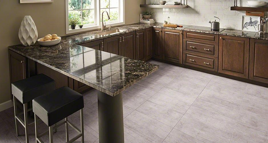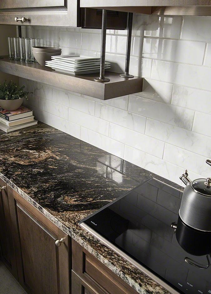 Рабочие поверхности покрыты полированными плитами черного гранита Black Forest. Этот камень смотрится органично и ярко - его текстура привлекает внимание и вносит нотку динамики в общее пространство. Коричневые и бурые прожилки интересно гармонируют с кухонным гарнитуром.
